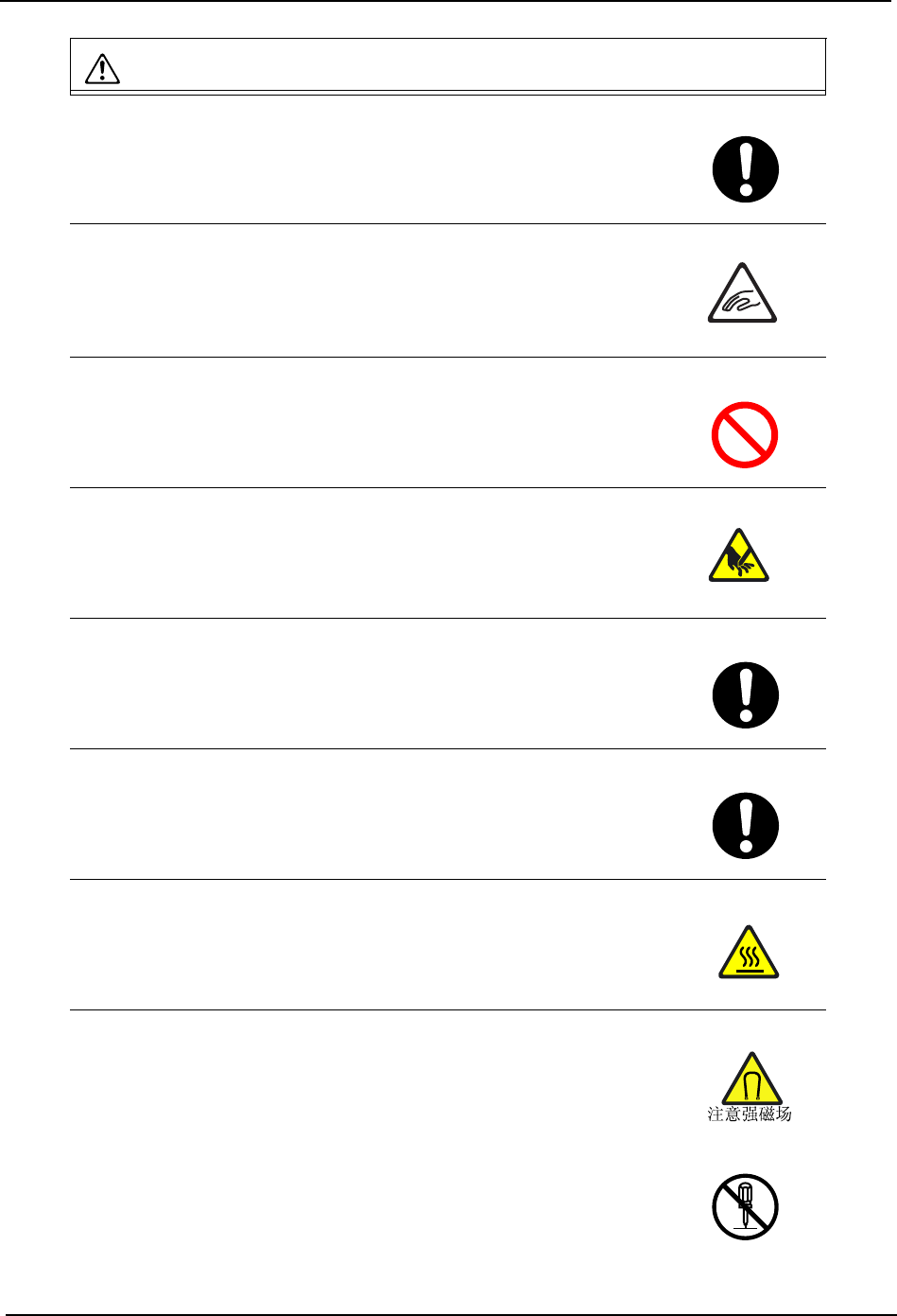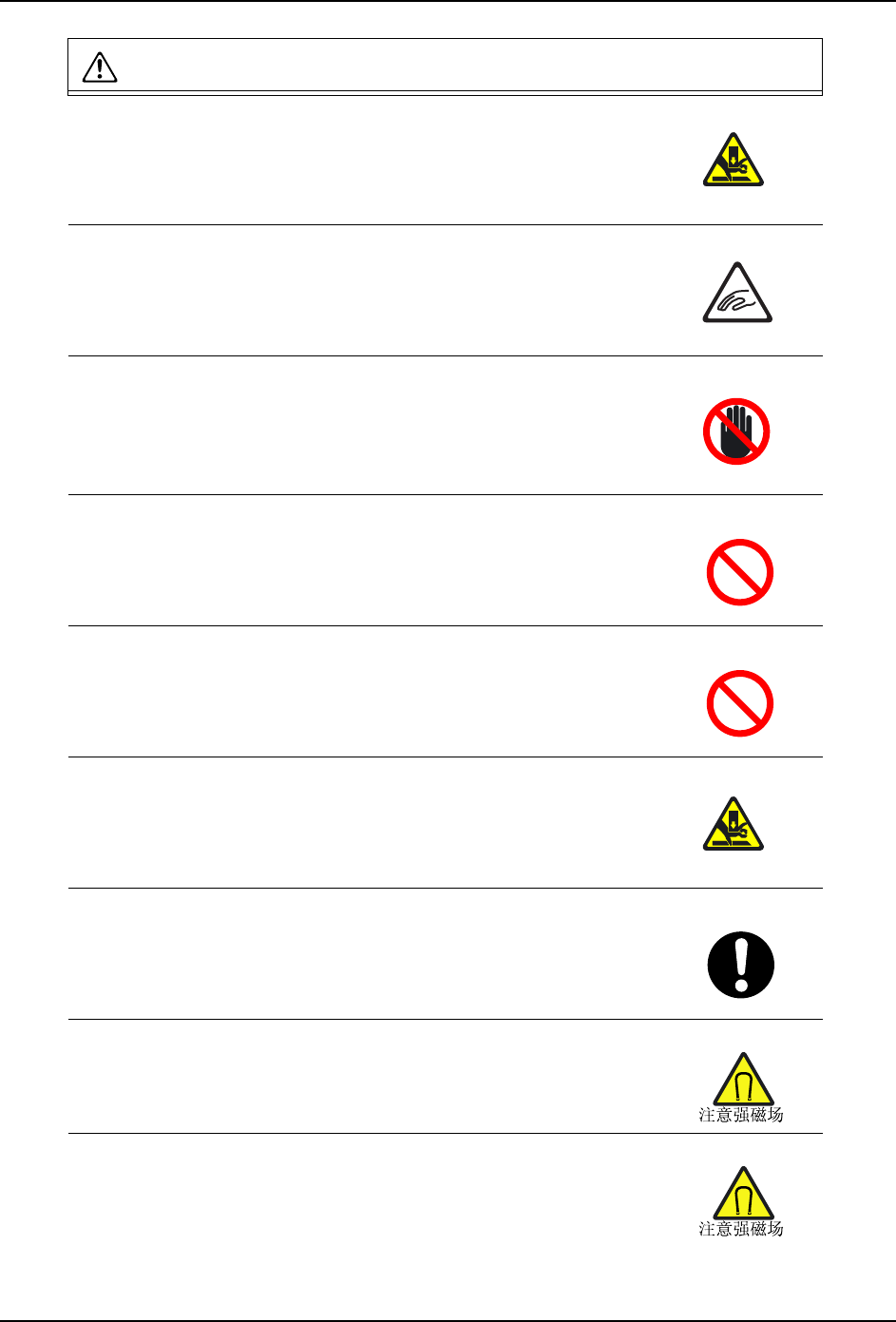 QD023-07 1. 安全指南 NXT 安装手册 7 在使 MCU 停下时,必须锁住脚轮。 · 在不同的地面状态下,MC U 有可能滑出。 在抬起支撑板时,请注意手指不 要被夹在支撑板和调整宽度的滚珠 丝 杆、六角轴之间,也不要被搬运 轨道边角擦伤。 · 手指有受伤的危险。 在抬起支撑板时,不要采用过于 勉强的姿势。 · 支撑板有自重、姿势过于勉强有 可能使腰部受伤。 严禁将手伸入废料带处理单元的 输送槽中。 · 输送槽中有非常锐利的…