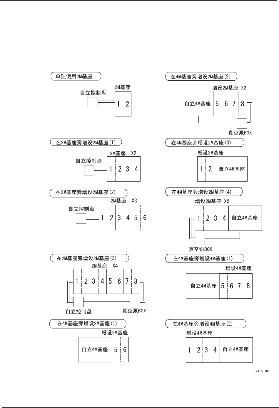 QD023-07 3. 机器的安装 NXT 安装手册 41 3.8 NXT 基座的增设 对自立型 NX T 的基座设置 增设型基座的步骤。 自立型 NXT 之间连接时,请参照 [ 3.7 NXT 之 间的连接 ]。 3.8.1 增设类型 请从以下 10 种增设类型中选择。不能增设除此以外的类 型。