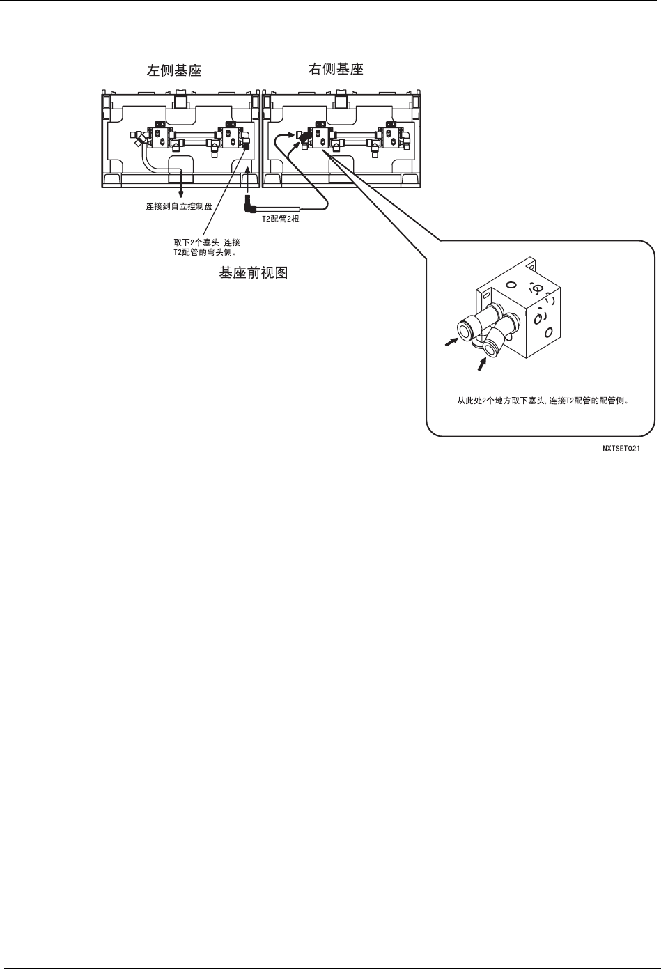 QD023-07 3. 机器的安装 NXT 安装手册 51 气源配管的连接 基座的连接 完成信号电缆的连接及气源管的 配管后, 用专用支架连接相邻基座。 请参照 [3.8.13 增设的 固定 ]。