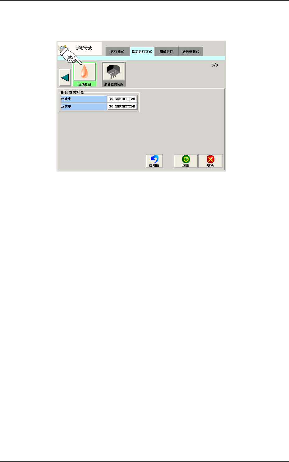 2OM-1752 1-53 4.2.11 涂助焊剂 ( 助焊剂涂敷 ) 在 “ 指定运行方式 ” 选项卡中,按下 [ 涂助焊剂 ] 按钮,便显示以下界面。 F2A41 使用助焊剂涂敷单元 ( 选购件 ) 时设定。 1304-001 4.2指定运行方式