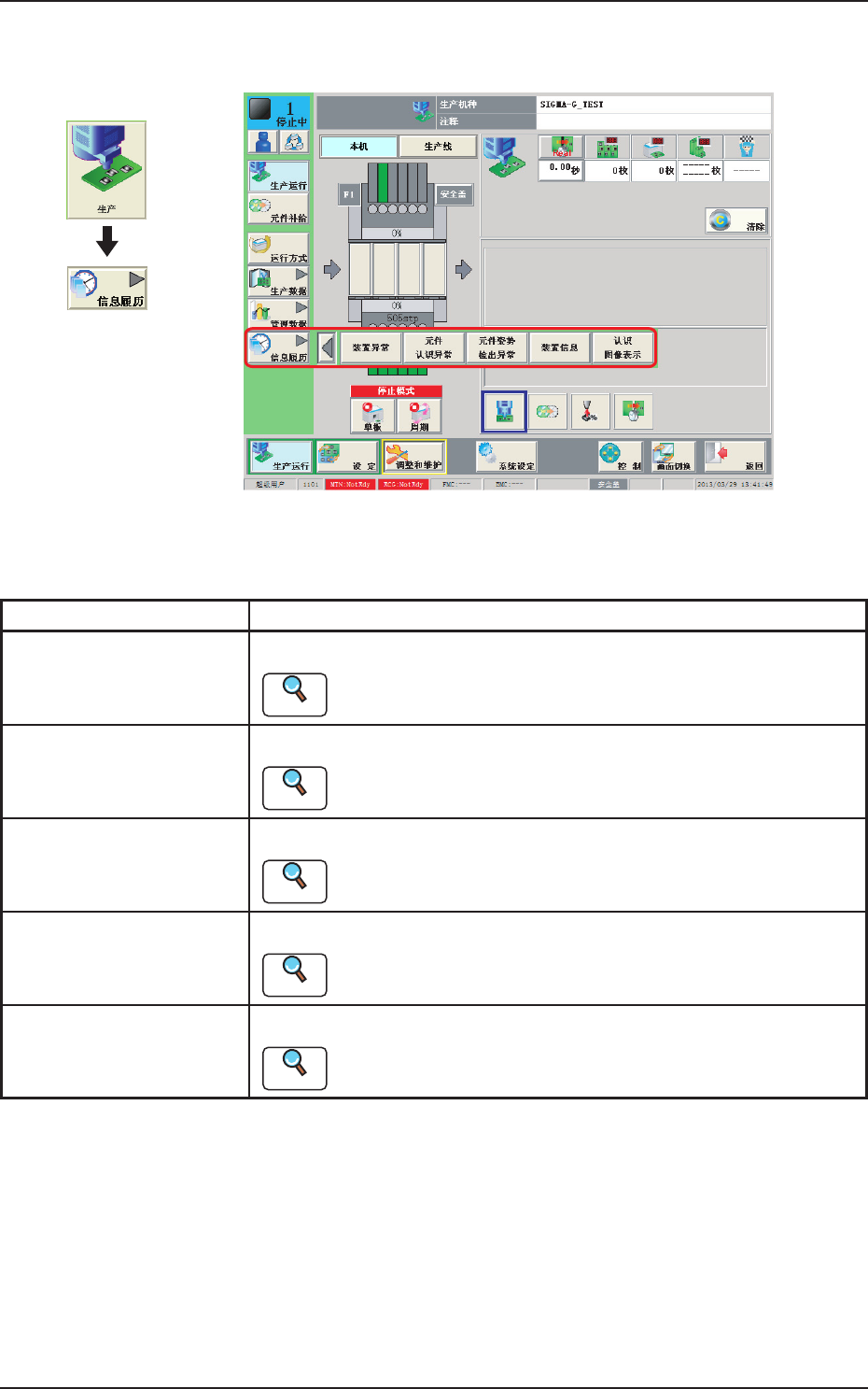 2OM-1752 1-60 1304-001 7. 信息履历 “ 信息履历 ” 界面F2A48 “ 信息履历 ” 子菜单分为以下 5 个 Tab,按下按钮,便显示各界面。 界面 内容 装置异常 显示装置异常的异常履历。 Reference 详细内容请参照 “ 第五章2.装置异常 ” 章节。 元件认识 ( 识别 ) 异常 显示元件识别异常的异常履历。 Reference 详细内容请参照 “ 第…