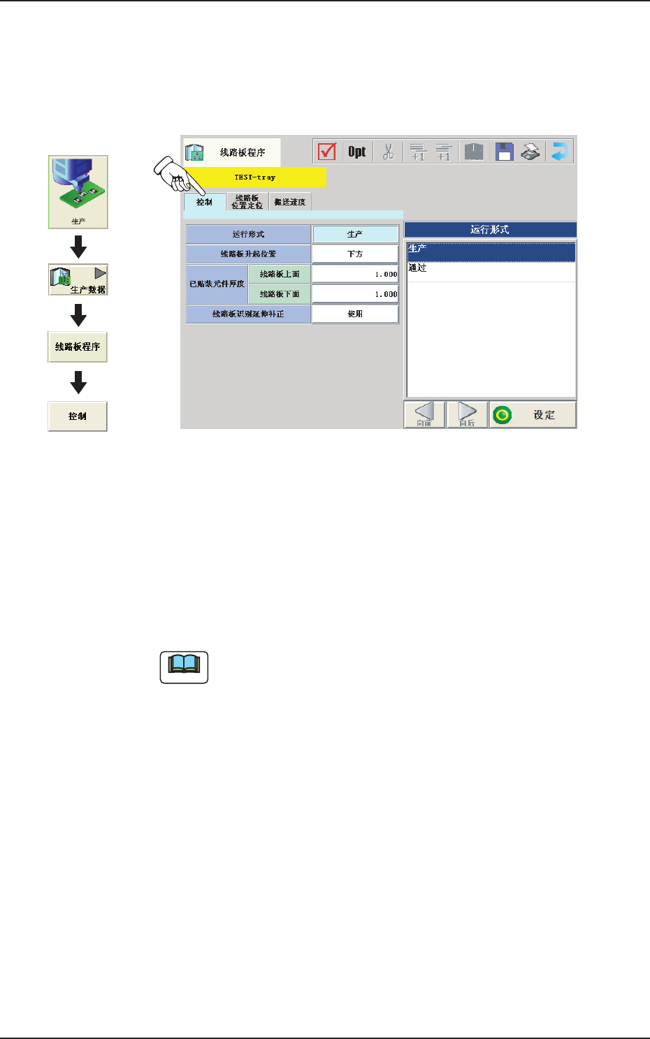 2OM-1752 2-35 3.4 控制 (D01)控制数据 在 “ 控制 ” 界面中,按下 [ 控制 ]Tab,便显示以下界面。 F2B30 (D01_01) 运行形式 设定运行形式为 “ 生产 ” 或 “ 通过 ” 。 通常选择 “ 生产 ” 。 生産 :进行生产运行。 通過 :进行通过运行。 Note 将设定为 “ 通过 ” 的线路板程序安装在生产机种数据时,真空泵自动 被关闭。 1304-001 界…