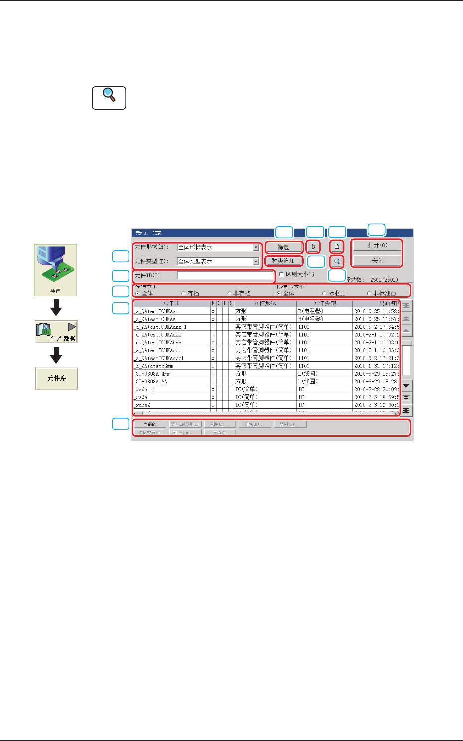 2OM-1752 3-2 1304-001 [3] 元件 ID 一览 显示元件 ID 一览。 在一览中选择在 “ 元件数据库 ” 编辑界面显示的元件 ID 和进行删除、 复制、名称变更的元件 ID。 元件 ID : 显示元件 ID。 R : 显示有 r 的元件 ID 表示根 ID。 根 ID 为连接、复制时的原始的元件 ID。 C : 显示有 c 的元件 ID 表示常用登录。 P : 显示有 p 的元件…
