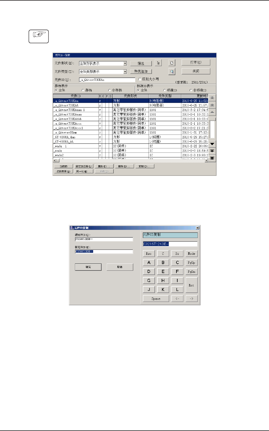 2OM-1752 3-6 1304-001 1.2.3 元件 ID 复制 Procedure (1) 选择要复制的元件 ID。 ( 选定的元件 ID 显示为蓝色。) F2C4 (2) 按下 [ 复制 (C)] 按钮。 ( 显示 “ 元件 ID 复制 ” 界面。) F2C5 (3) 在 “ 新元件 ID(N) ” 输入新元件 ID 名,按下 [ 确定 ] 按钮。 ( 新的元件 ID 被创建。) 1.2 “ 元件 …