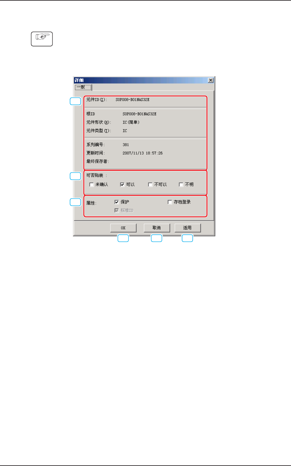 2OM-1752 3-10 1304-001 1.2.7 元件 ID 详细 ( 属性 ) Procedure (1) 选择要显示属性的元件 ID。 (2) 按下 [ 属性 (P)] 按钮。 ( 显示 “ 详细 ” 界面。) [1] [2] [3] [4] [5] [6] F2C12 [1] 元件 ID、根 ID、元件形状、元件类型、 系列编号、更新时间、最终保存者 显示元件 ID 的属性数据。 [2] 可否贴装 (…