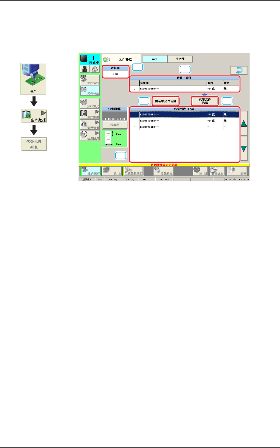 2OM-1752 3-18 1304-001 3. 代替元件列表 用切换机种时的 PP 检查参照代替元件列表,检查其代替元件是否为能替换 的数据。 [1] [2] [3] [4] [5] F2C20 [1] 送料器 ( 送料器编号 ) 显示送料器编号。 [2] 贴装中元件 显示贴装中元件的信息。 [3] [ 贴装中元件使用 ] 按钮 使用贴装中元件。 [4] [ 代替元件选择 ] 按钮 替换为从 “ 代替列表 ” 中选择的元件…