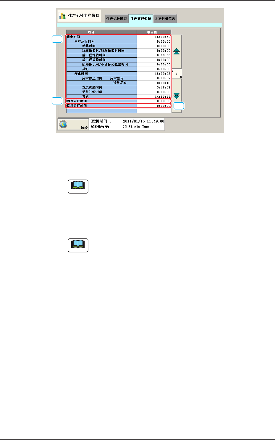 2OM-1752 4-23 1304-001 [12] [13] [14] “生产管理数据”选项卡 ((2/5)F2D16 [12] 通电时间 装置的控制电源处于通电状态的时间。 Note 显示例 10:03:50(10 小时 3 分 50 秒 ) 生产运行时间 生产运行的运转时间。 发生多次生产机种的设定时,将合计其总值。 Note 也包括 “ 测试运行时间 ” 。 贴装时间 从生产线路板第 1 点的…