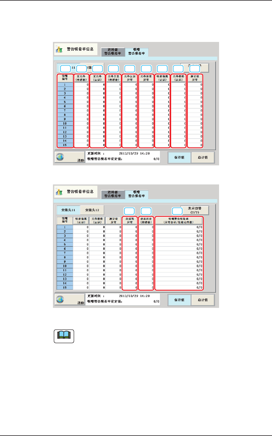 按各安装头分别显示吸嘴警告吸取率的界面。