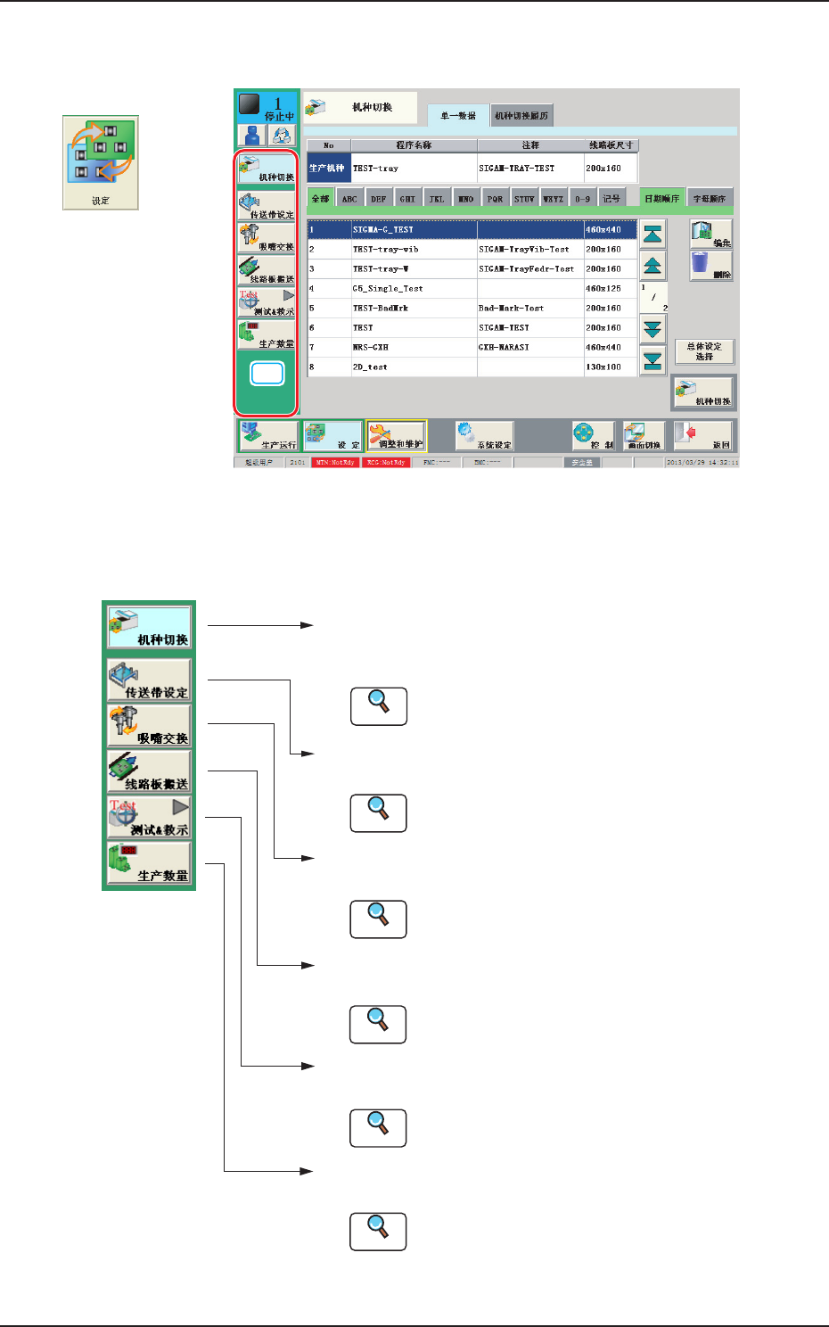 2OM-1752 6-2 2. 设定 [1] F2F2 [1] “ 设定 ” 主菜单栏 “ 设定 ” 主菜单栏中配置有以下按钮。 [机种切换]按钮: 显示 “ 机种切换 ” 界面。 通常该界面作为初始界面显示。 请参照 “ 第六章 3.机种切换 ” 章节。 [传送带设定]按钮: 显示 “ 传送带设定 支撑针(支撑销) ” 界面。 请参照 “ 第六章 4.传送带设定 ” 章节。 [吸嘴交换]按钮: 显示 “ 吸嘴交换 ” 界面。 …