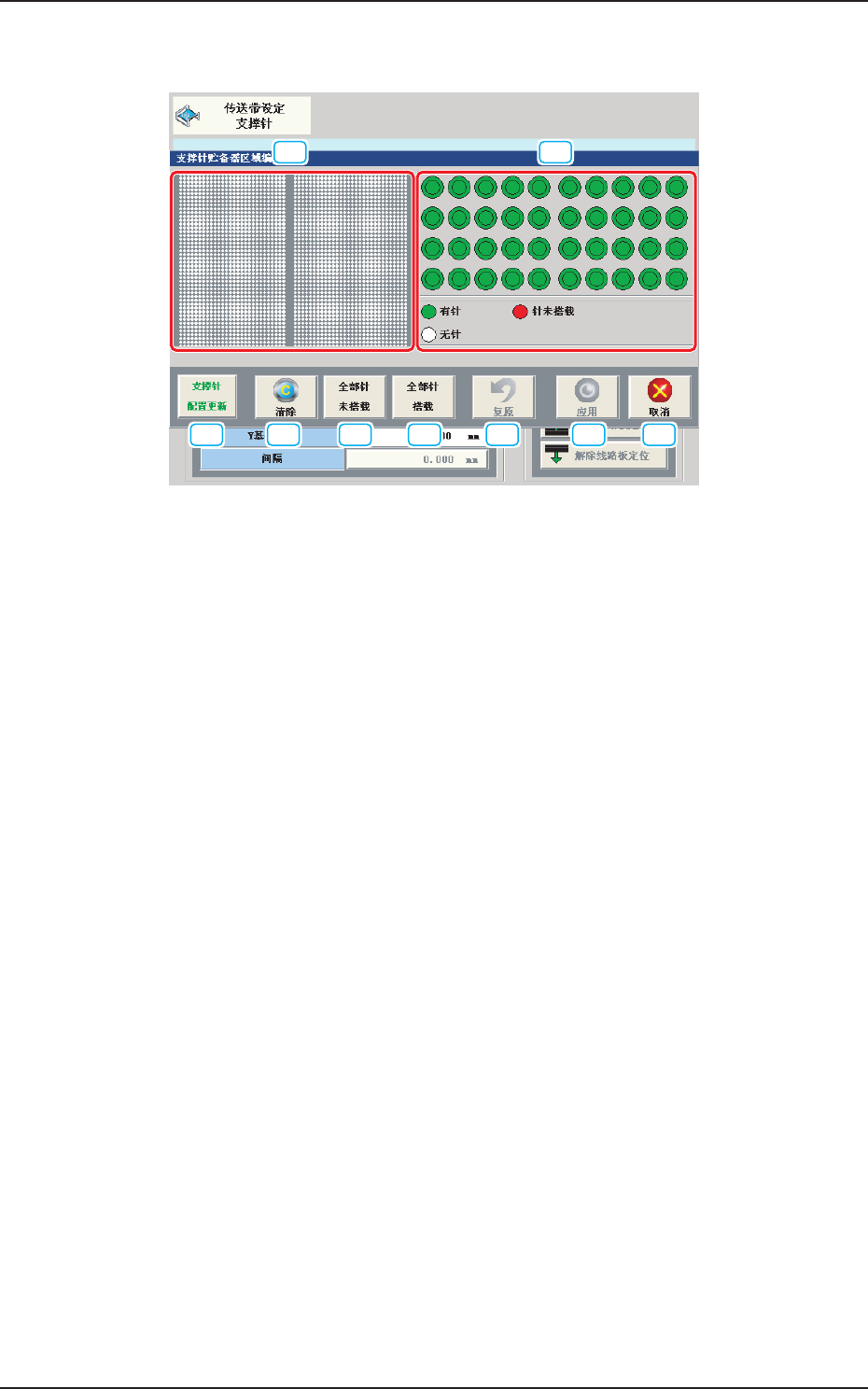 2OM-1752 6-13 1304-001 4.2 支撑针贮备器 ( 支撑销保管 ) 区域编辑 [1] [2] [3] [4] [5] [6] [7] [8] [9] F2F15 [1] 线路板支撑针位置显示部 图像显示支撑台。 显示线路板支撑销的配置状况。 [2] 保管区域图像显示部 图像显示线路板支撑销的保管区域。 点击相应的针,就切换有针和针未搭载。 绿 : 有针 红 : 针未搭载 白 : 无针 [3] [ 支撑针配置更…