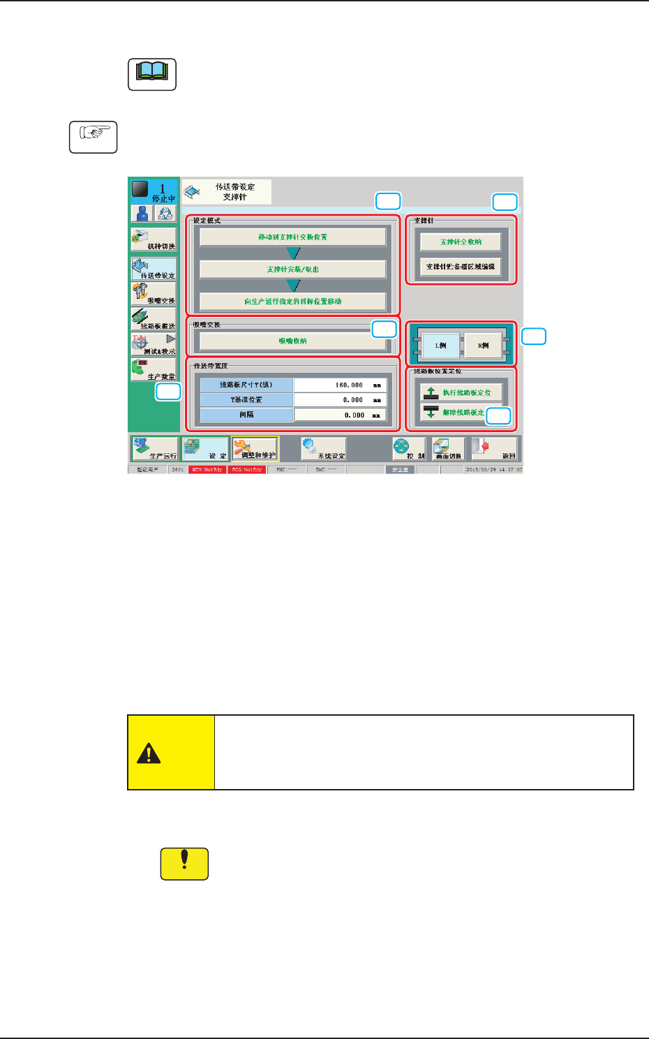 2OM-1752 6-15 4.2.1 支撑针贮备器 ( 支撑销保管 ) 区域编辑步骤 Note 前基准的线路板流动方向为从左到右。 Procedure (1) 按下 “ 设定 ” 主菜栏的 [ 传送带设定 ] 按钮,显示以下界面。 [1] [2] [3] [4] [5] [6] F2F16 (2) 按下 [ 移动到支撑针交换位置 ] 按钮,在 10 秒钟内再按操作台的 [START] 按钮。 ( 安装头待避,传送宽度放宽到最大宽度。…