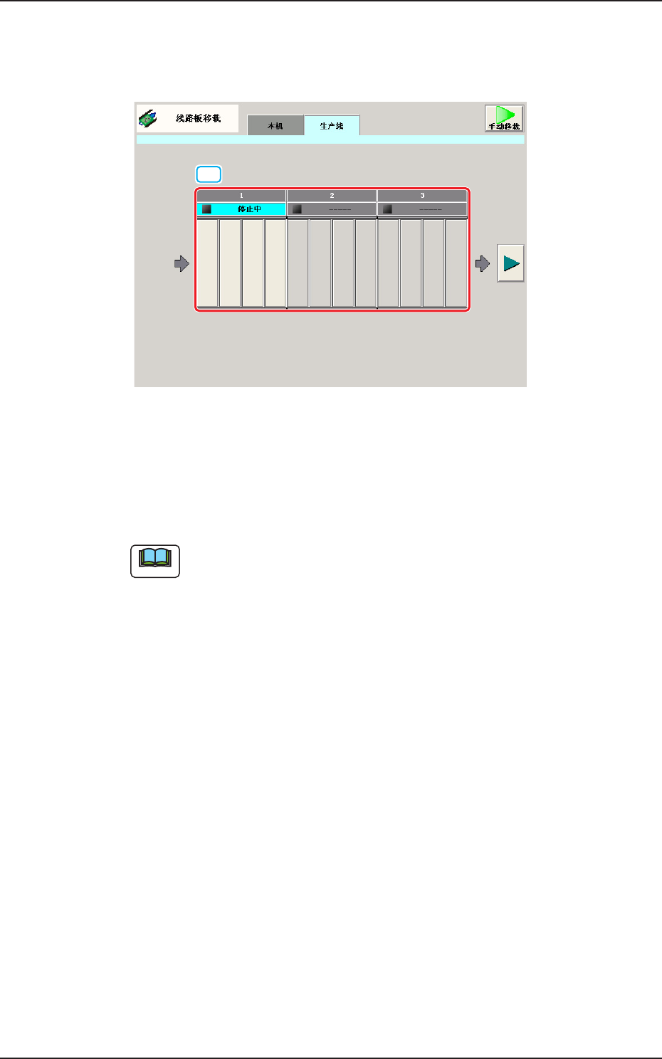 2OM-1752 6-26 1304-001 6.3 手动移栽 ( 移载 ) 手动进行线路板移载。 [1] [2] [2] [4] [3] F2F31 [1] 传送带图像显示部 图像显示的传送带各模块显示为按钮。 按下传送带模块按钮后,在 10 秒钟内再按操作台的 [START] 按钮,线 路板被搬送到该位置。 [2] 线路板位置决定 ( 线路板位置决定 L、R) 进行线路板定位。 按下 [ 实行 ] 按钮,在 10 秒钟内再按操…