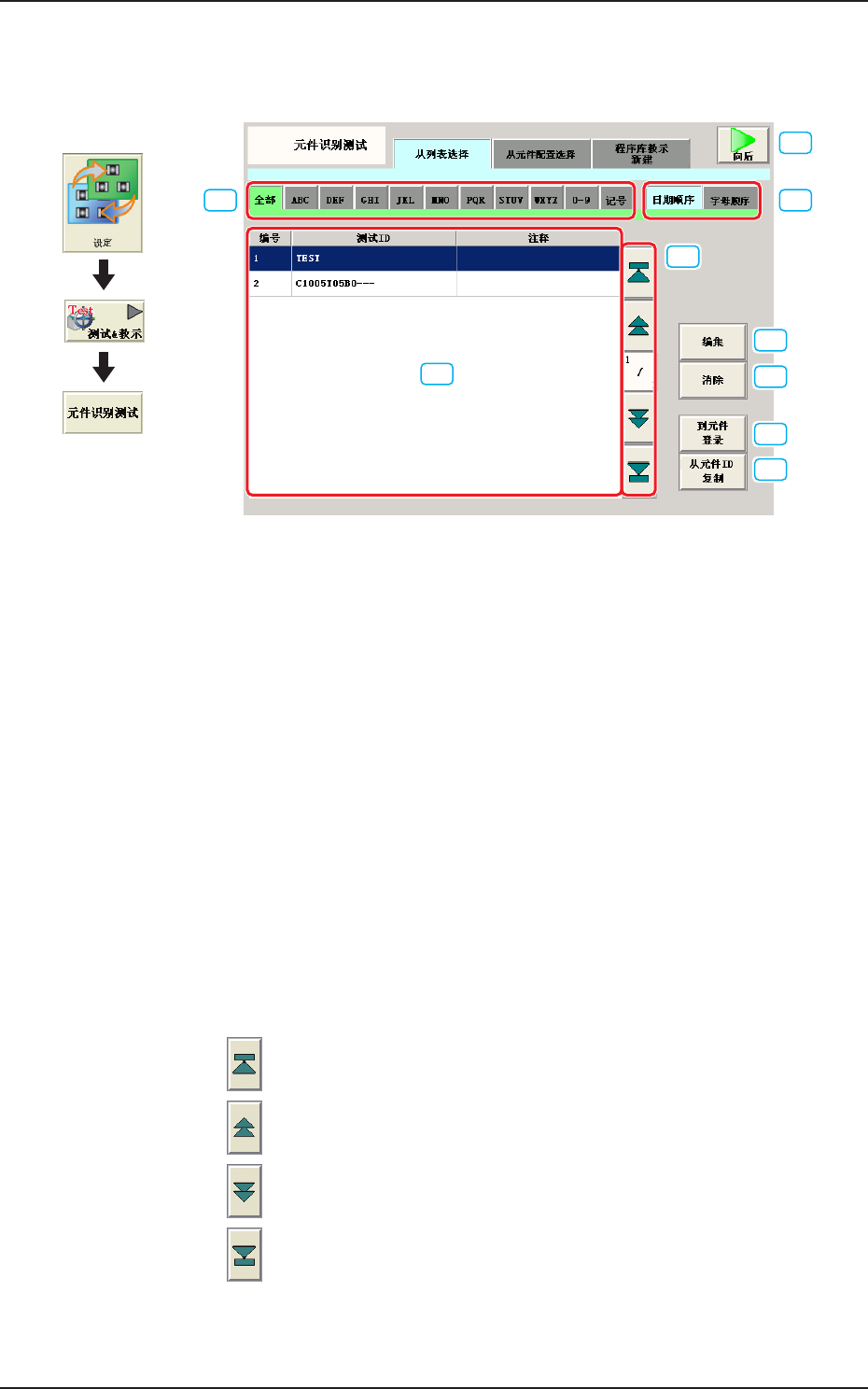 2OM-1752 6-44 1304-001 [5] [ 编集 ( 编辑 )] 按钮 编辑 [3] 中选择的测试 ID。 Reference 关于编辑方法请参照 “ 第三章元件数据库 ” 章节。 [6] [ 清除 ] 按钮 清除 [3] 中选择的元件 ID。 [7] [ 到元件登录 ( 登记到元件 ID)] 按钮 将在 [5] 中编辑的测试 ID 登记到元件 ID 中。 [8] [ 从元件 ID 复制 ] 按钮 从元件…