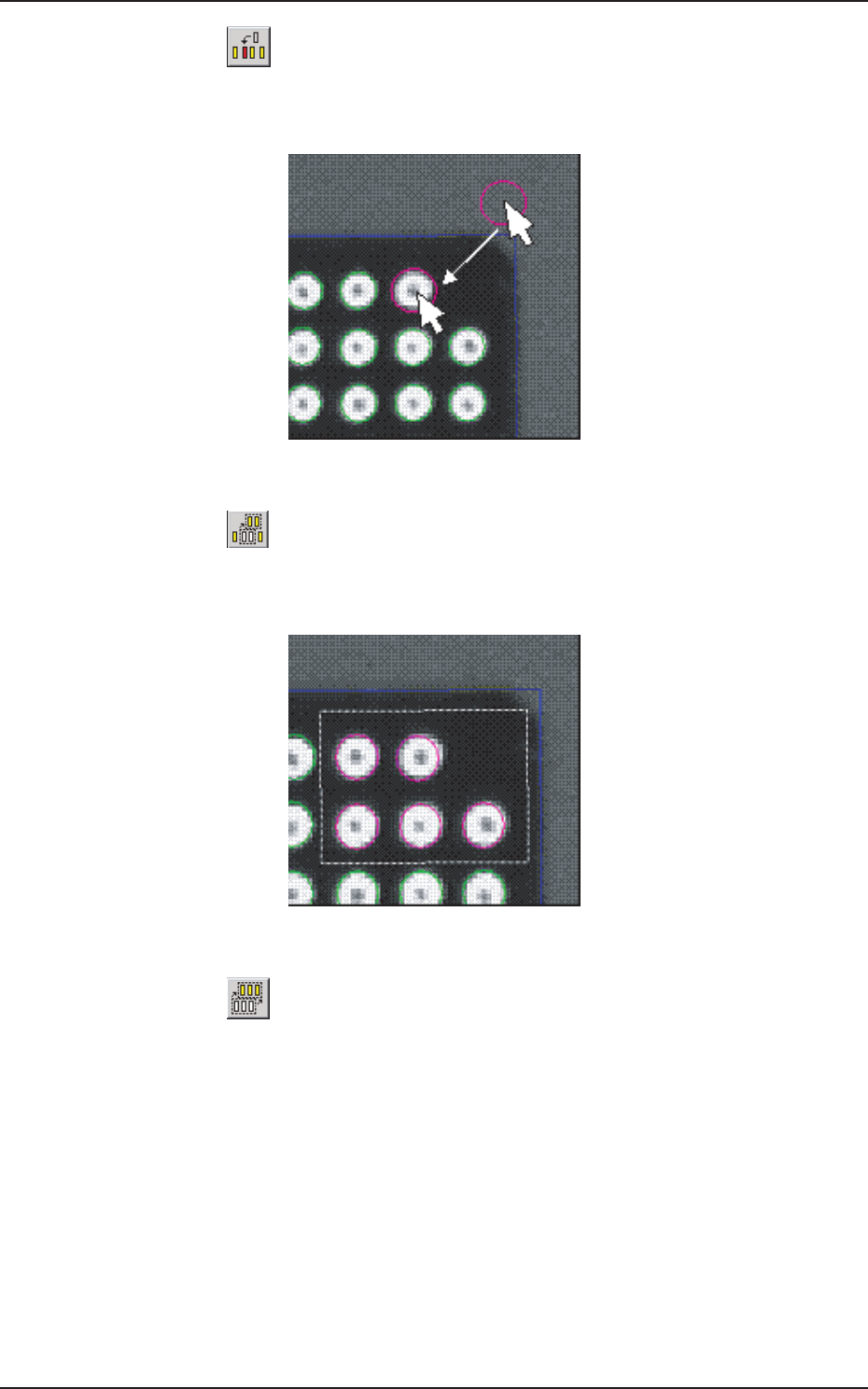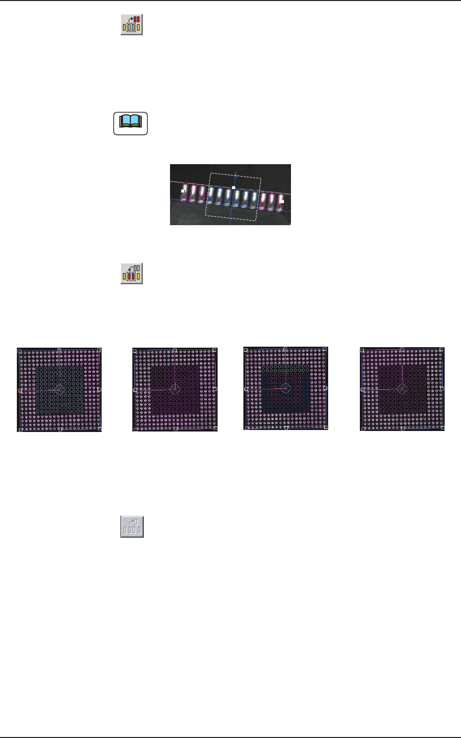 2OM-1752 6-66 1304-001 [15] [ ] 按钮 插入一个电极。 按此按钮后,在图像上点击,拖动到想要插入的位置。 F2F62 [16] [ ] 按钮 选择矩形圈住的复数电极。 想要稍微集中移动复数电极时使用。 F2F63 [17] [ ] 按钮 选择电极全体。 以模型为中心,想要稍微移动电极全体时使用。 7.3 元件识别测试
