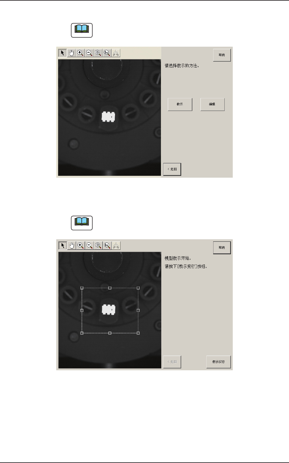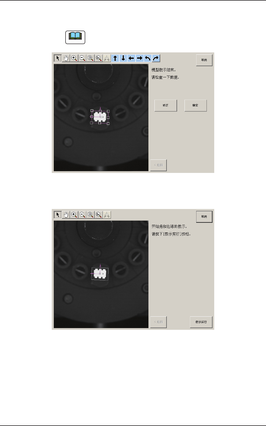 2OM-1752 6-80 1304-001 (5) 选择 [ 教示 ] 按钮。 Note 选择了 [ 编辑 ] 按钮时,以样品数据作为基础进行编辑作业。 请按下 [ 完毕 ] 按钮,切换到元件数据库教示界面。 F2F90 (6) 开始模型教示,按下 [ 教示实行 ] 按钮。 Note 请确认在如下虚线领域内是否有元件,偏离时请再次进行调整。 F2F91 7.3 元件识别测试