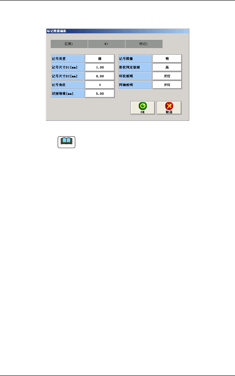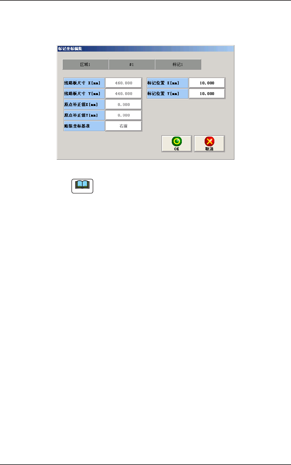 2OM-1752 6-94 1304-001 [4] [ 标记数据编集 ( 编辑 )] 按钮 请按下各按钮,设定线路板识别标记数据。 F2F116 Note 在 “ 生产机种数据设定 ” 界面中进行设定时,线路板识别标记数据被 设定。 [5] [ 移动实行 ] 按钮 将横梁移动到设定的位置。 [6] [ 目视对齐移动 ] 按钮 切换到用目视对齐进行识别位置指定的界面。 [7] [ 认识 ( 识别 ) 实行 ] 按钮 按下按钮,便…