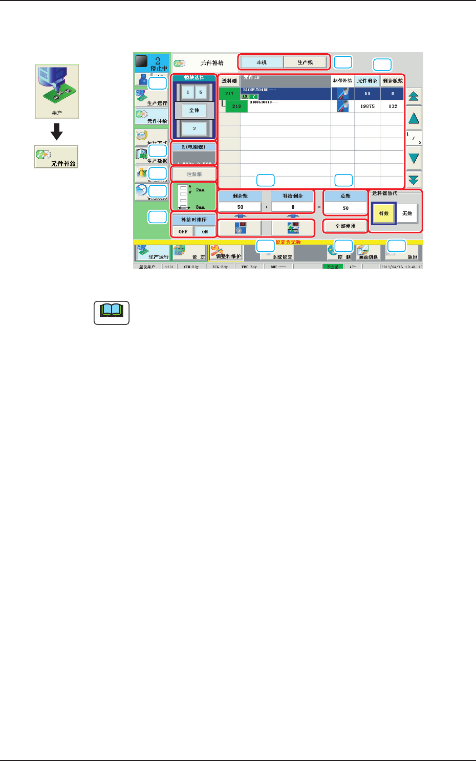 2OM-1752 1-12 3. 元件补给 [1] [3] [4] [2] [9] [7] [10] [6] [5] [8] [11] [12] “ 元件补给 ” 界面 F2A11 Note 界面显示根据所选择的选项而有所不同。 [1] 模块选择 显示送料器模块的图像。 按下各模块按钮,对应模块的送料器信息便显示在 “ [2]送料器一览 ” 中。 1304-001 界面展开 3. 元件补给