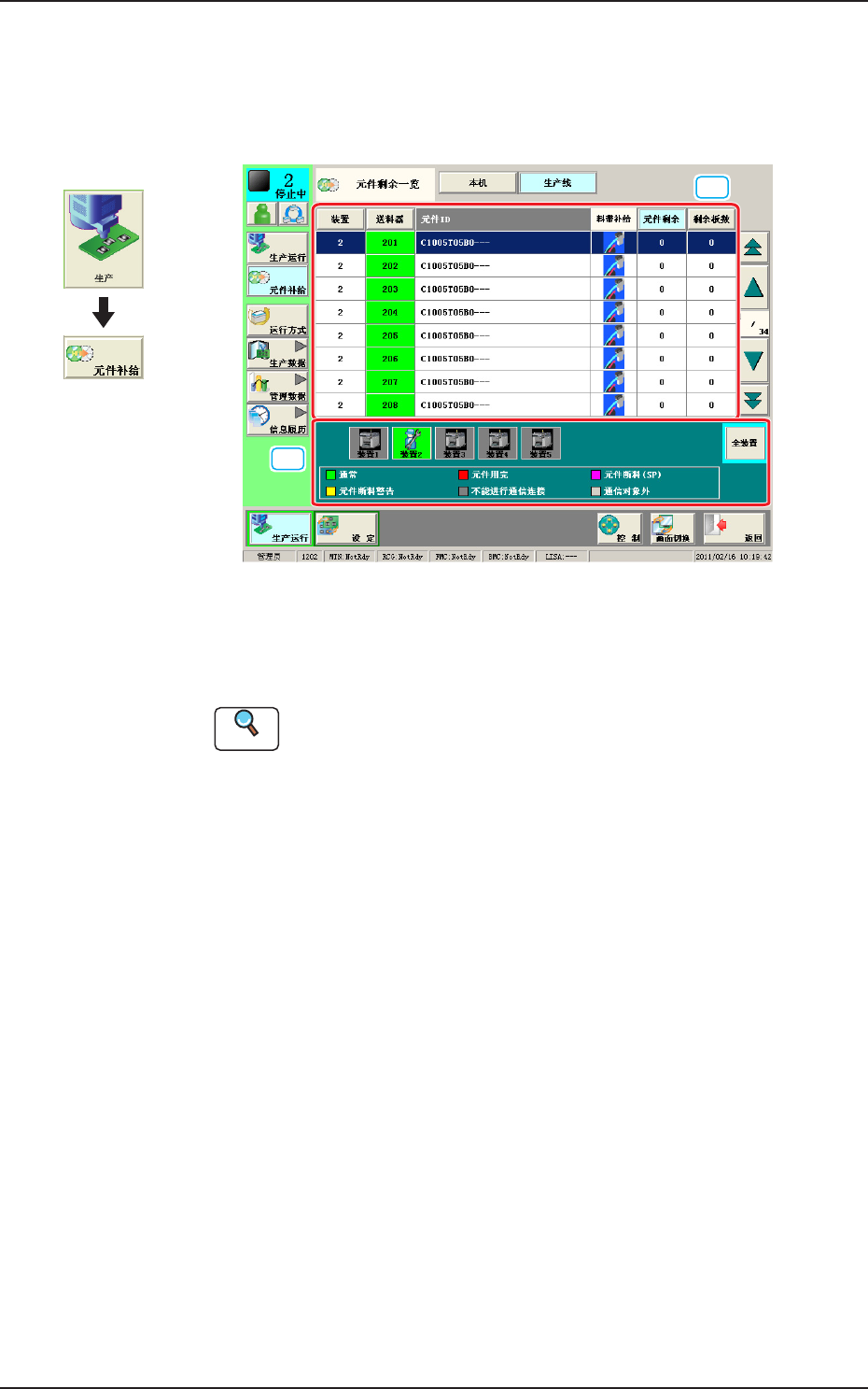 进行生产线元件剩余数一览的确认。