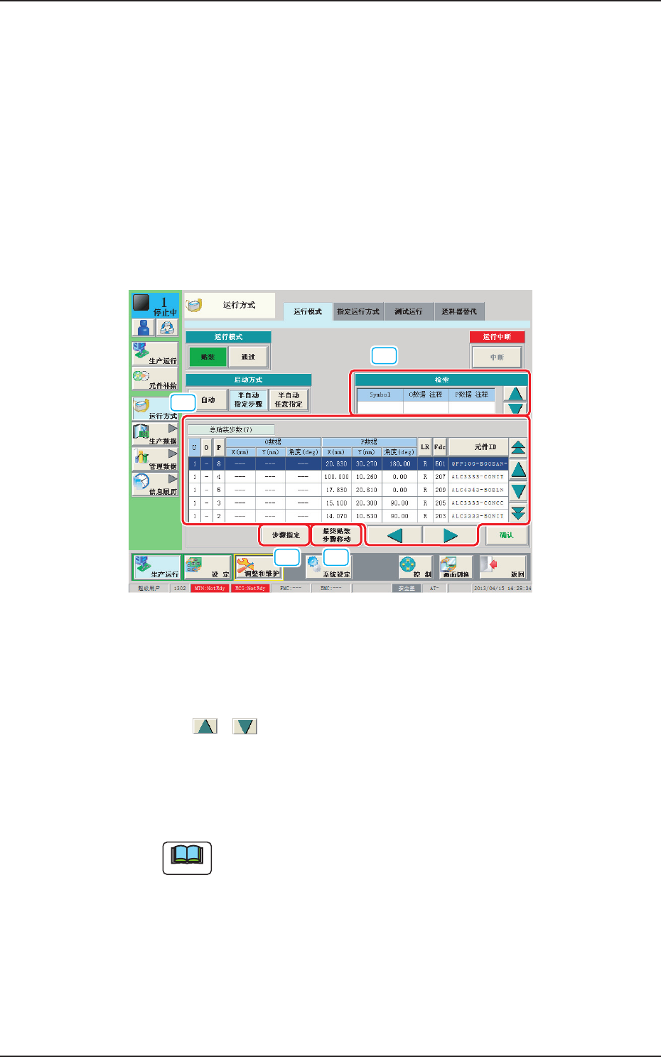 2OM-1752 1-19 [2] 启动方式 按以下按钮,指定启动方式。 [ 自动 ] 按钮 自动开始。 [ 半自动指定步骤 ] 按钮 实施指定的步骤 (1 元件 / 点 )。 [ 半自动步骤任意指定 ] 按钮 实施指定的步骤 ( 可以指定多个 )。 [3] 运行中断 按下 [ 中断 ] 按钮, “ 暂停 ” 状态被解除,装置便进入 “ 停止中 ” 状 态。 Note 在生产运行中按下操作台的 [STOP] 按钮时等装置进入 “ 暂…