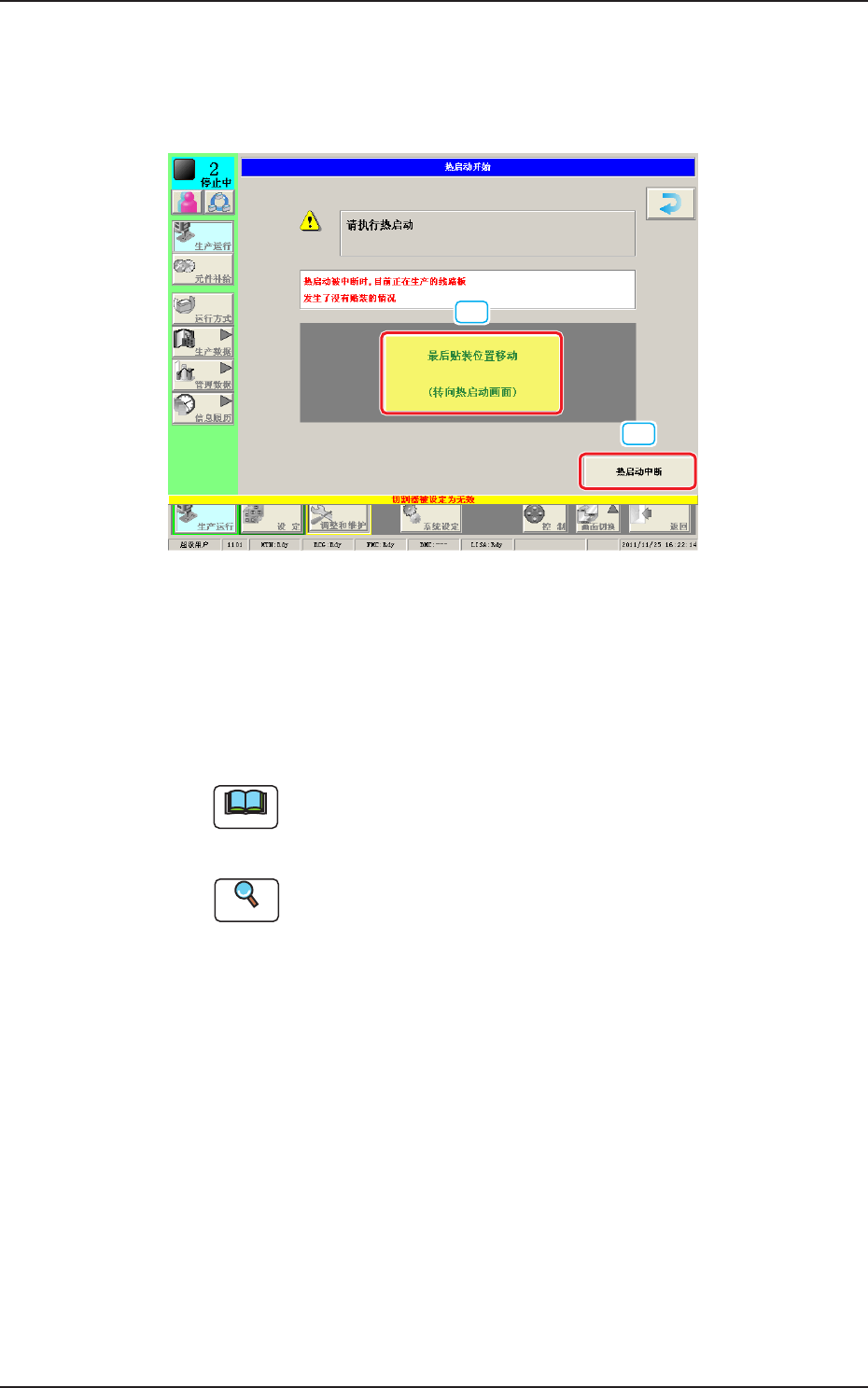 2OM-1752 1-25 4.1.2 在 “ 允许热启动开始 ” 状态下的 “ 运行模式 ” 界面 在生产运行中中断装置运行,便进入可以进行热启动的状态,并显示 “ 热启 动开始 ” 界面。 [1] [2] F2A21 [1] [最终贴装位置移动 ] 按钮 按此按钮,便移行到 “ 最终贴装点确认 ” 界面。 [2] [ 热启动中断 ] 按钮 中断热启动。 Note 只能以超级用户显示。 请注意,如中断了热启动开始,则再启动时在…