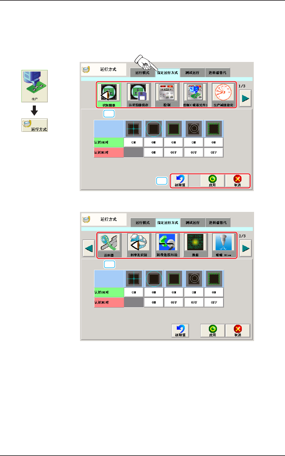 2OM-1752 1-27 4.2 指定运行方式 按下 [ 指定运行方式 ]Tab,便显示作为初始显示界面的 “ 指定运行方式 ” 选项卡 ( 第一页 )。 [1] [2] “ 指定运行方式 ” 选项卡 ( 第一页 )F2A23 [1] “ 指定运行方式 ” 选项卡 ( 第二页 )F2A24 1304-001 界面展开 4.2指定运行方式