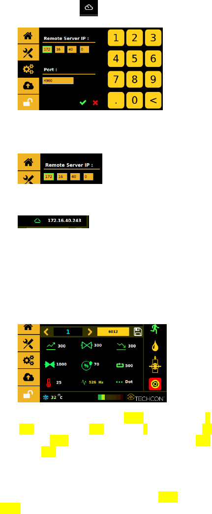 42 2. Touch th e clould icon t o prompt up the Rem ote sever 3. Enter i n the Remote sever IP and use the 4900 default for the Po rt . 4. If the conn ection is succe ssful a Green Clould should appear. 5. Use an y T CP/I…