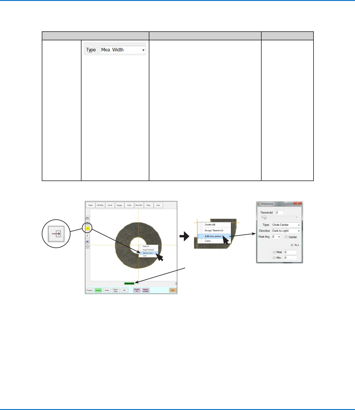 Accessing the Add New Arrow function on the Camera tab, and the resulting AOI Arrow parameter window