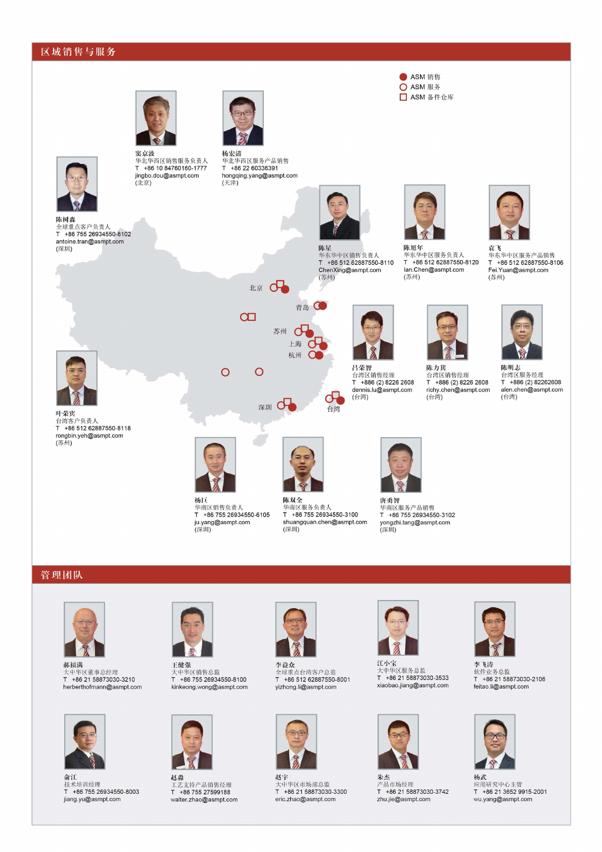 区 域 销 售 与 服 务 • ASM 销售 O ASM 服务 □ ASM 备件仓库 窦京波 华北华西区销售服务负责人 T + 86 10 84760160 - 1777 杨宏淸 华北华西区服务产品销售 T + 86 22 60336391 jingbo . dou @ asmpt . com hongqing . yang @ asmpt . com ( 北京 ) ( 天津 ) £ 1 陈树森 全球重点客户负责人 T + 86 755…