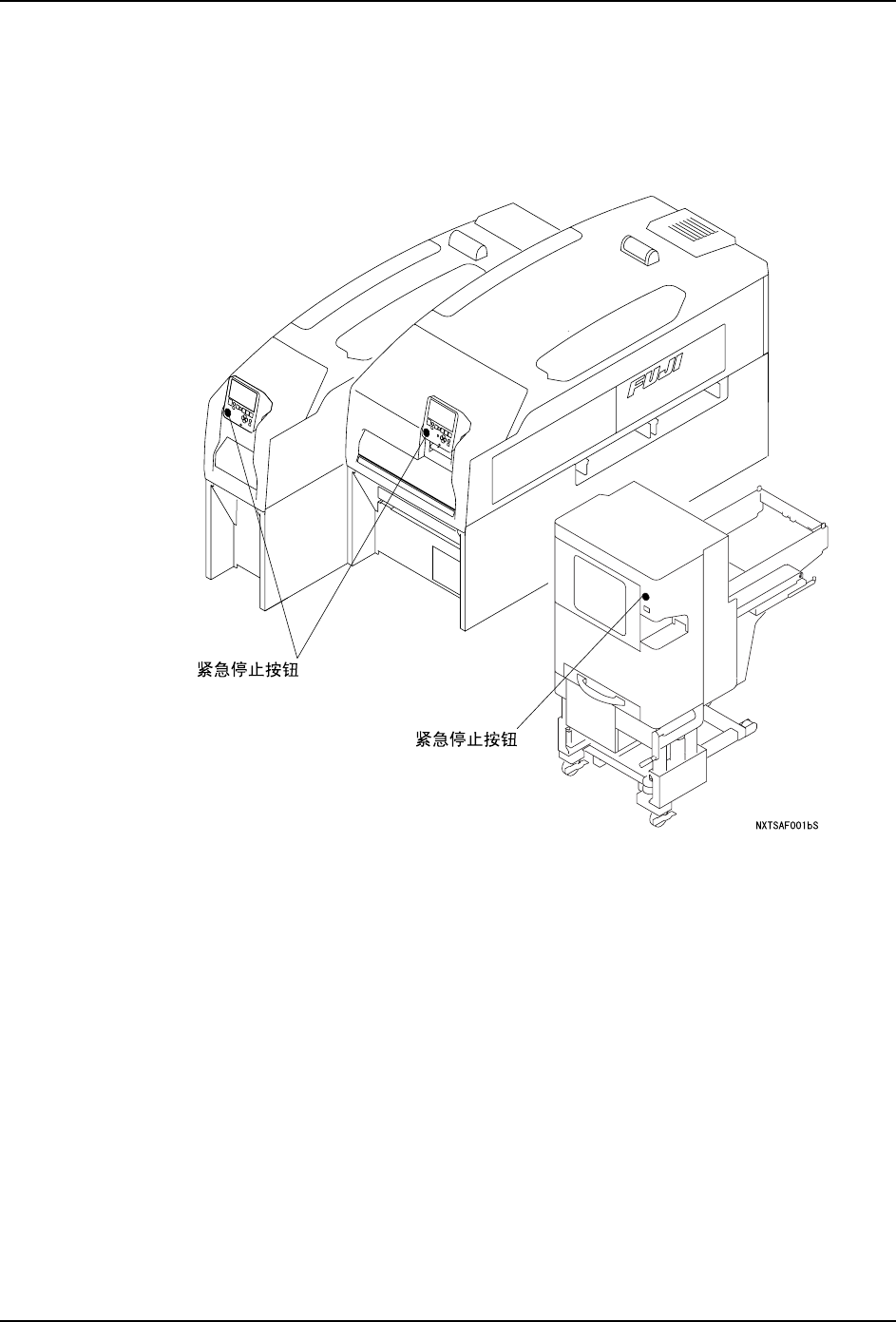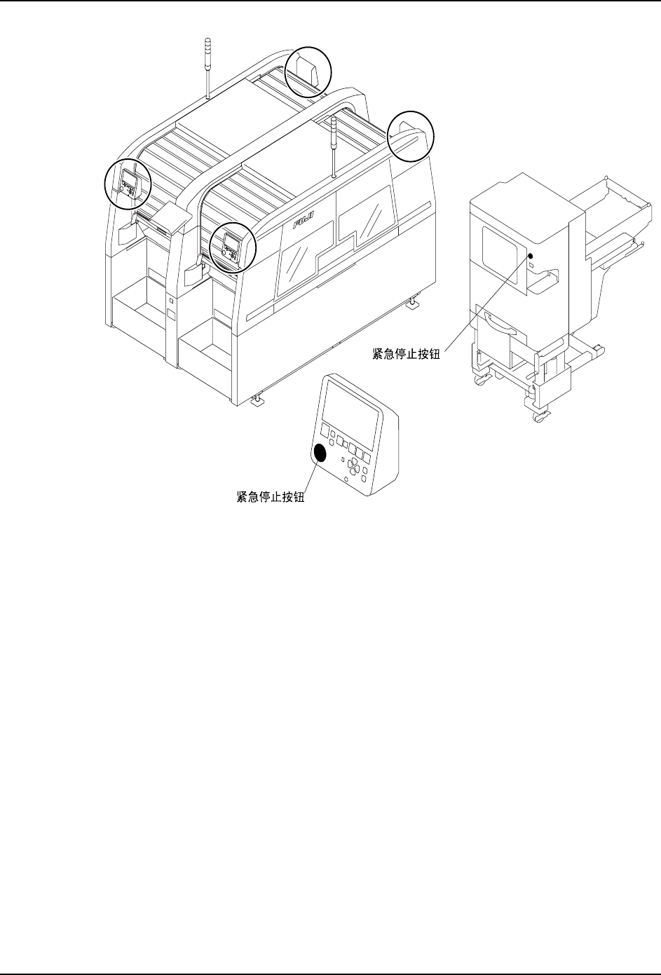 发生紧急情况时,请按下机器上红色的紧急停止按钮停止机器运转。紧急停止按钮的位置请