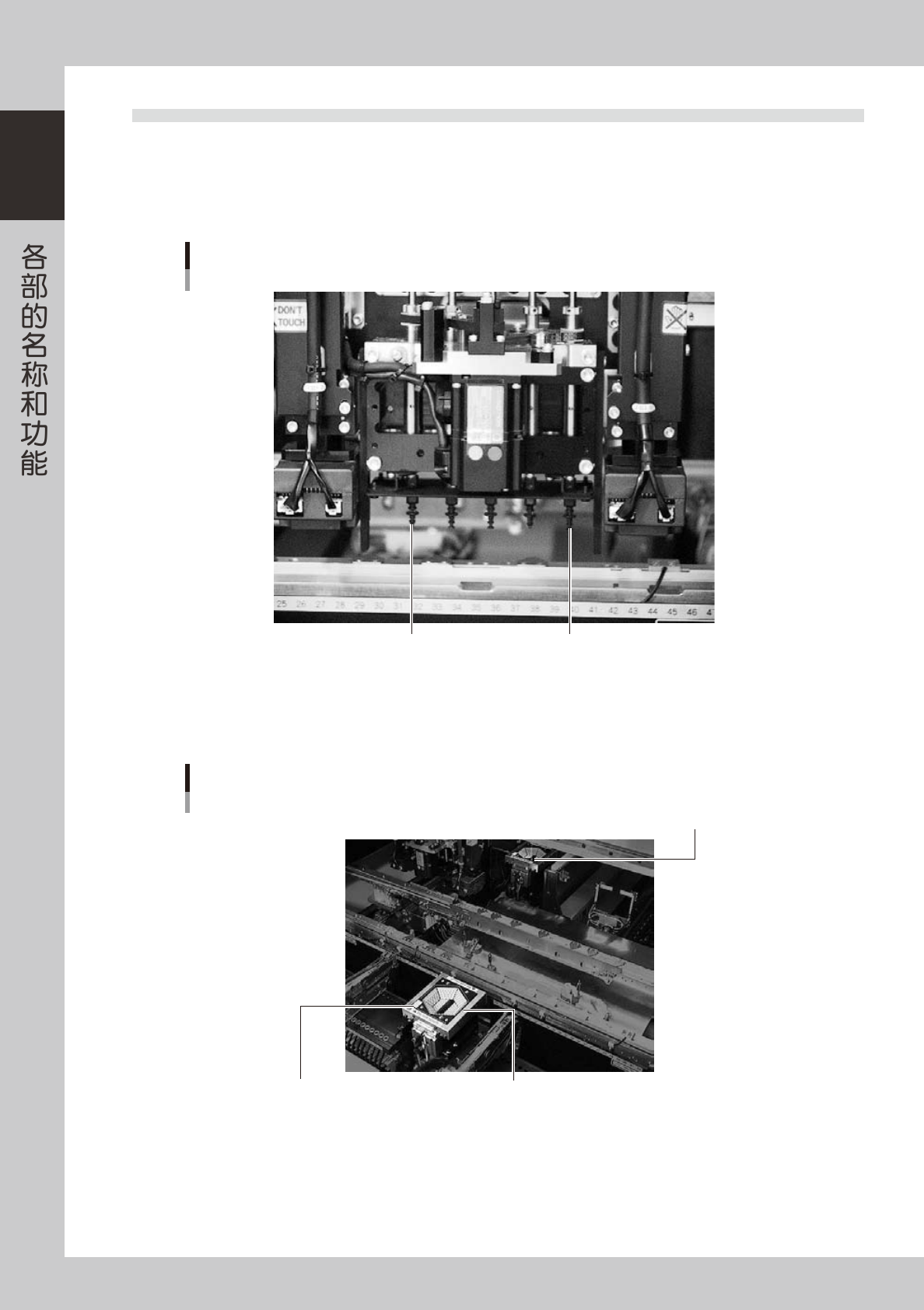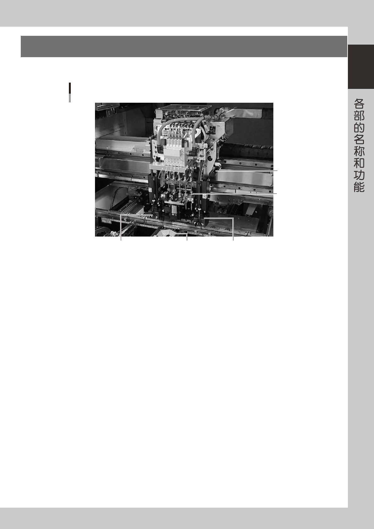 1-5 1 3. 贴装头部 贴装头部安装在贴片机的 XY 轴上,进行元件的吸附和贴装。以下,介绍贴装头部的构成和吸嘴的种类。 贴装头部 基准标记识别相机 照明装置(选配) 扫描相机 基准标记识别相机 照明装置 5连贴装头 移动贴装头 用的把手 25104-M7-00