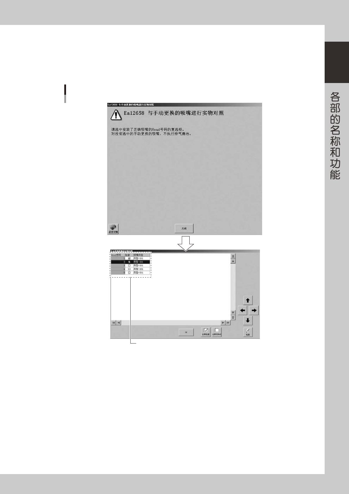 1-19 1 3 显示「与手动更换的吸嘴进行实物对照」对话框。 4 对要执行排气清洁的吸嘴进行设置。 按「与手动更换的吸嘴进行实物对照」对话框的 [ 关闭 ] 按钮,显示「手动更换吸嘴的实物对照」画面。 选中要执行排气清洁的吸嘴后按 [OK] 按钮。 「与手动更换的吸嘴进行实物对照」对话框 选中要执行排气清洁吸嘴的选择框 26101-M7-00