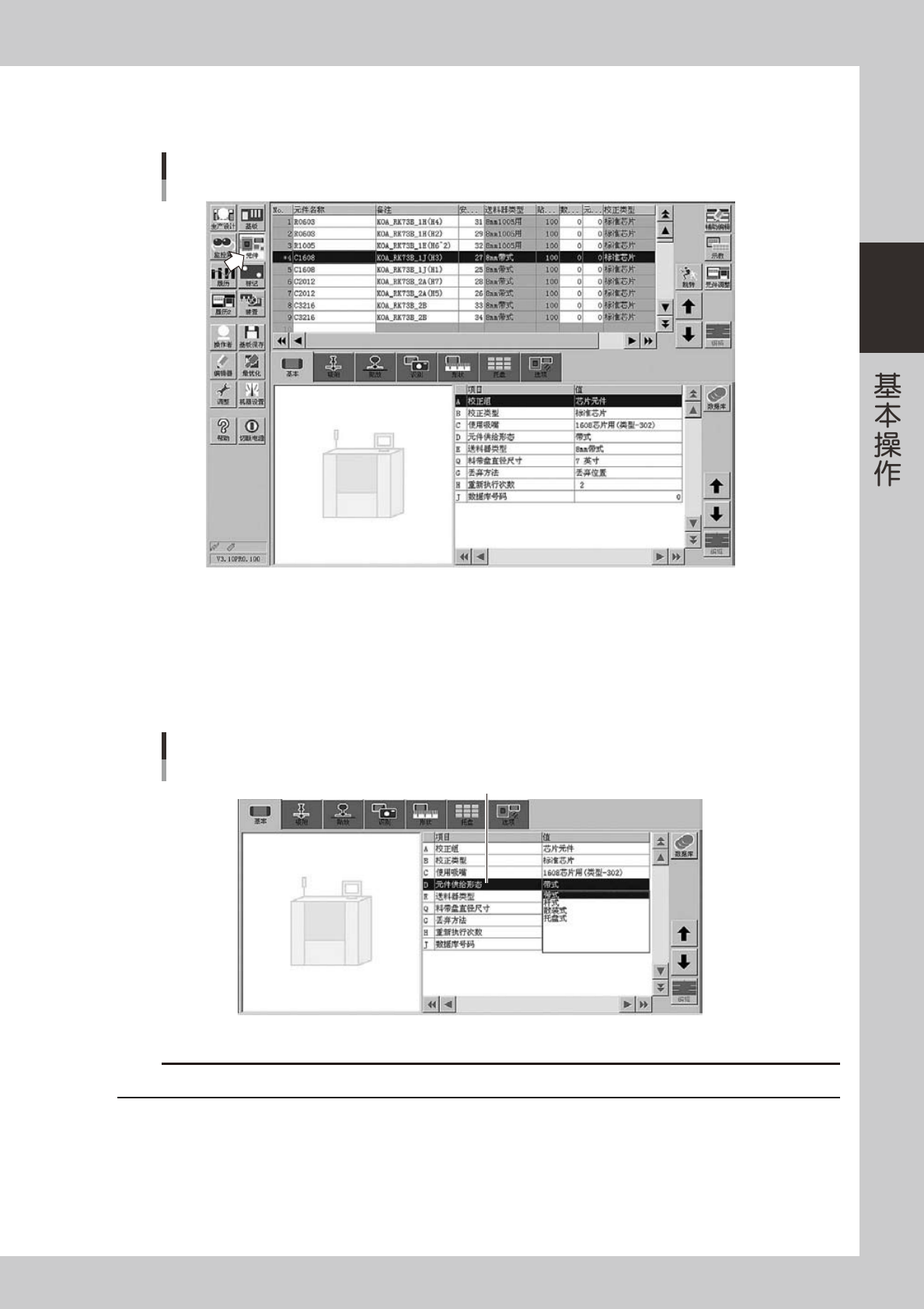 选择「D 元件供给形态」后双击输入栏,从下拉框的「带式、托盘式」中选择要使用的元件供给形态。