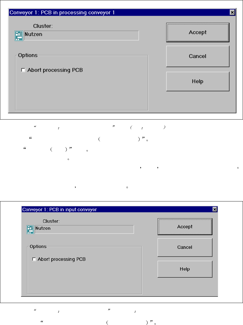 SIPLA CE 软件指南 SR.503.xx 3 图形用户界面 2001 年 12 月版 3.2 用户界面组件 27 ! 单击 Accpet 接 受 接 受 接 受 接 受 按 钮 PCB 处理 过 程即 可中止 尚未完 成装配的印 制电路板 被 传送到输 出 传送导轨上 这时 操作 员被提 示用手将 其 取 下 中止 处理 中止 处理 中止 处理 中止 处理 PCB HS-50 HS-50 HS-50 HS-50 3 3 ! 单击相…