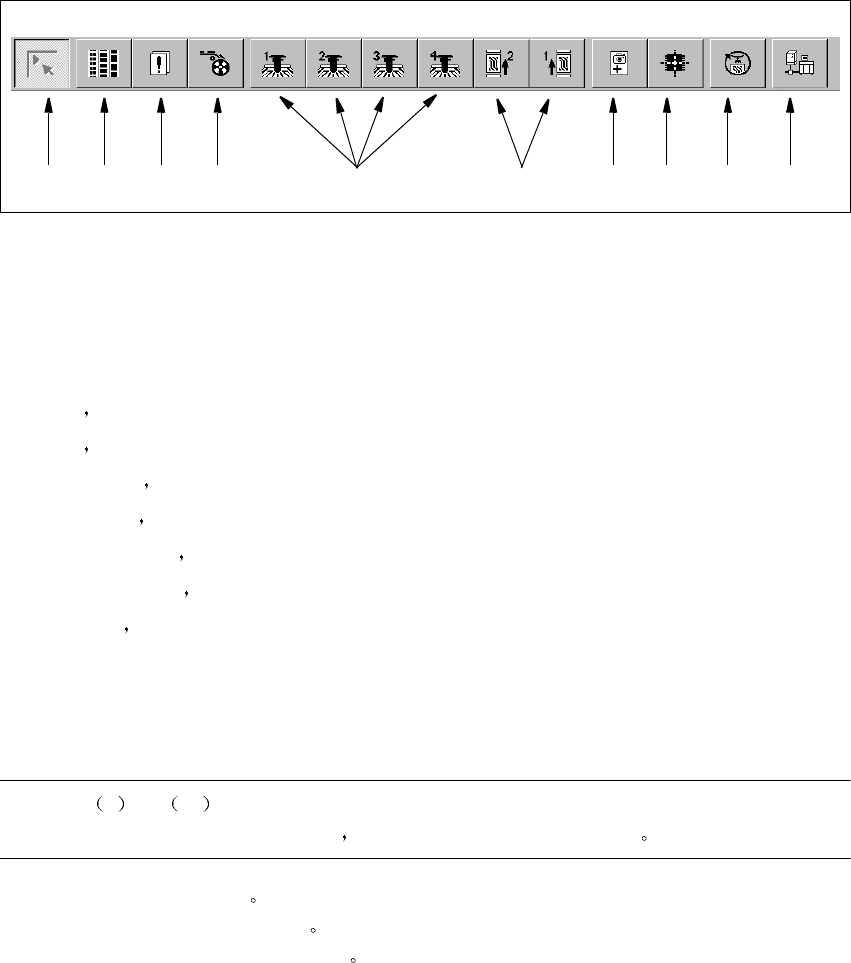 3 图形用户界面 SIPLAC E 软件指南 SR.503.xx 3.2 用户界面组件 2001 年 12 月版 32 3.2.2 主 主 主 主视图 视图 视图 视图中的工具 栏 中的工具 栏 中的工具 栏 中的工具 栏 3 Fig. 3.2 - 8 主视图中的 工具 栏 3 图例 图例 图例 图例 3.2 - 8 (1) 主视图 (2) 设 置 贴片功能 (3) 错误 贴片功能 (4) 元件供料器 贴片功能 (5) 悬臂 1 到 4…