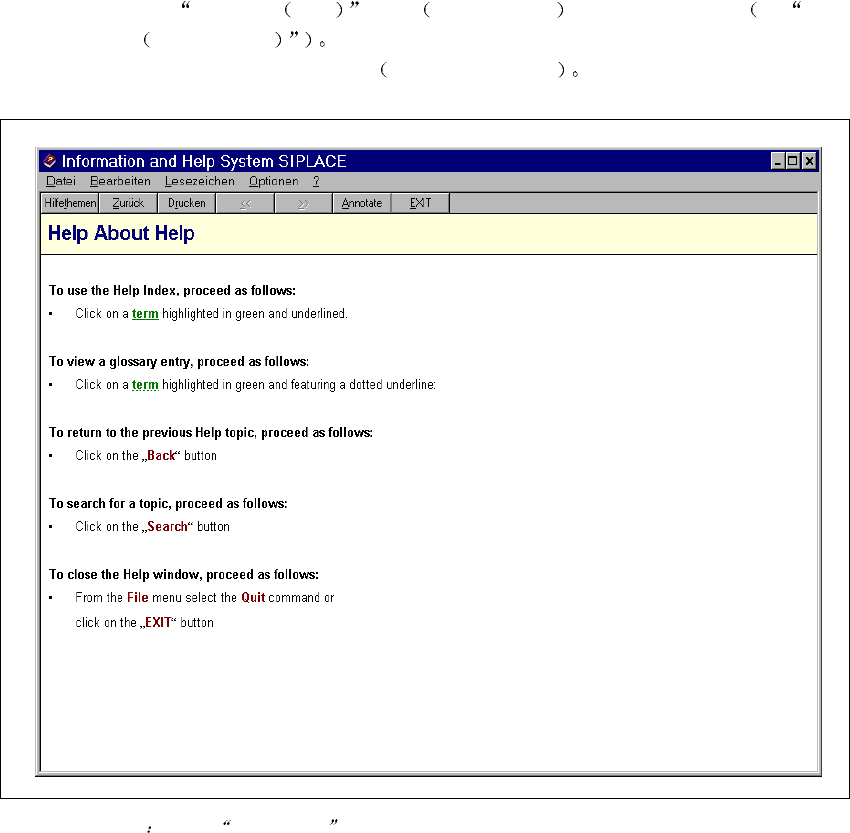 SIPLA CE 软件指南 SR.503.xx 6 联机帮助系统 2001 年 12 月版 6.1 总论 77 6.1.1.2 显示特定 主题区帮助 显示特定主题区 帮助 显示特定主题区 帮助 显示特定主题区 帮助 ! 单击帮助系统的 Content 内容 屏幕 参见图 6.1 - 2 中所需主题区的项 如 Help About Help 如何使用帮助 显示区将显示 所选的主题区 的帮助信息 参见图 6.1 - 3 示例 6 Fig. …