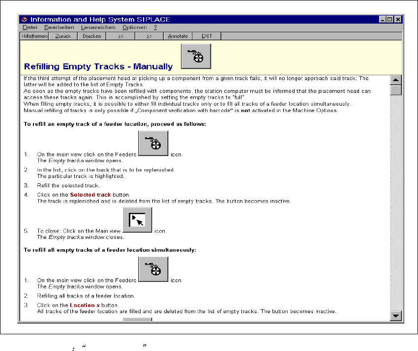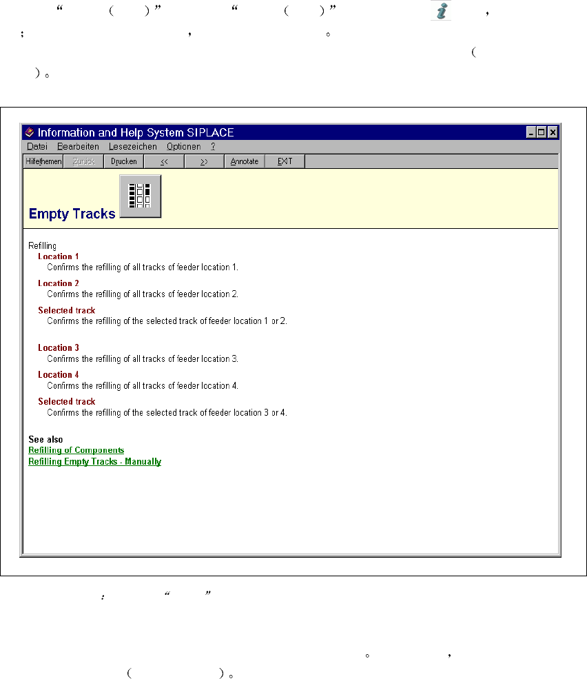 SIPLA CE 软件指南 SR.503.xx 6 联机帮助系统 2001 年 12 月版 6.1 总论 79 6 Fig. 6.1 - 5 示例 手动空料槽续 料 主题的帮 助窗口 6