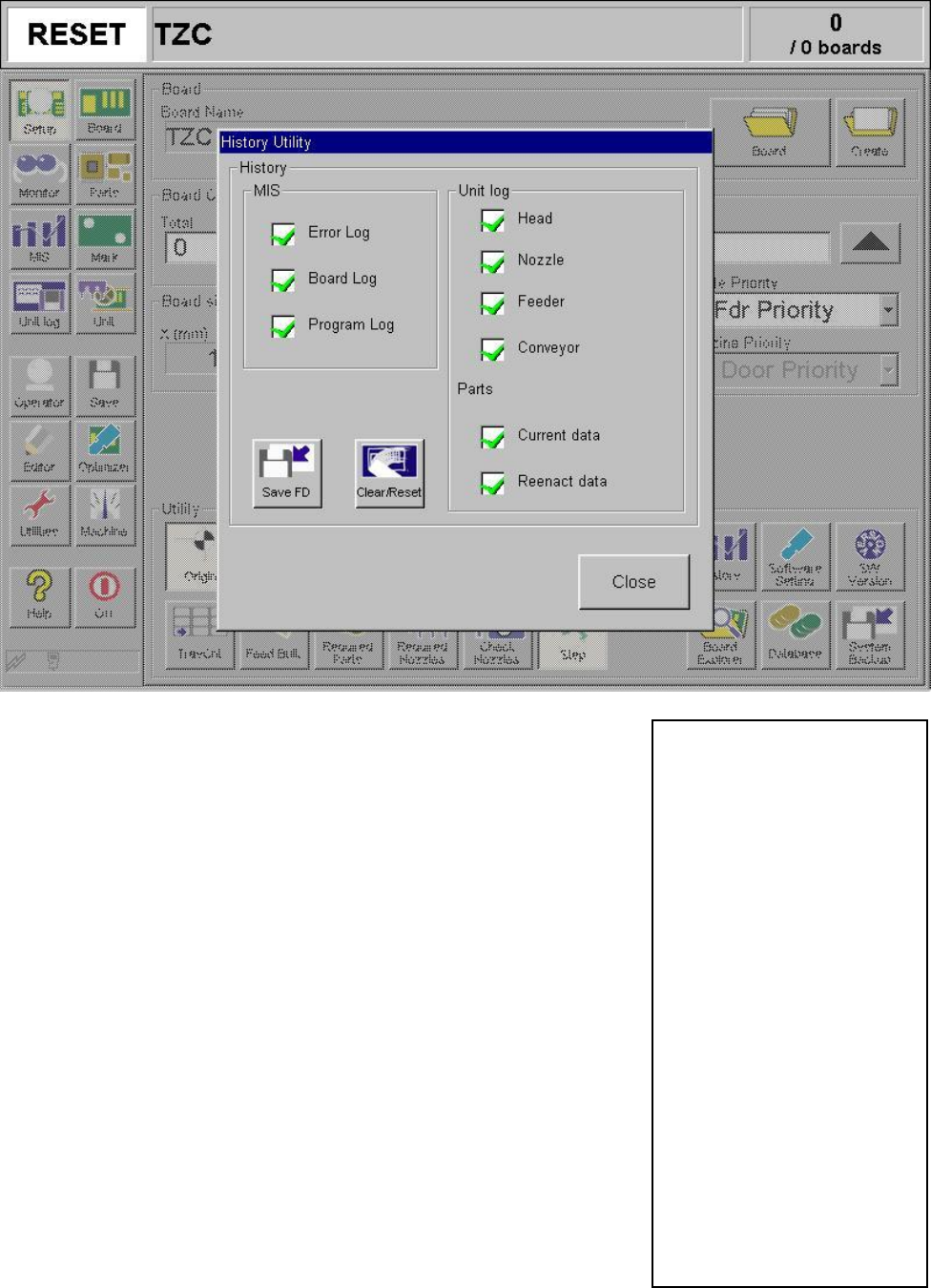 1. History Utility 歷史資料的儲存運用 2. MIS 資料管理 區 A : Error Log 錯誤記錄 B : Board Log 基板記錄 C : Pr ogram Log 檔案記錄 3. Unit Log 組件記錄區 A : Head 組件動作 記錄 B : Nozzle 組件動作 記錄 C : Feeder 組件動作記錄 D : Conveyor 組件動作 記錄 備註欄: