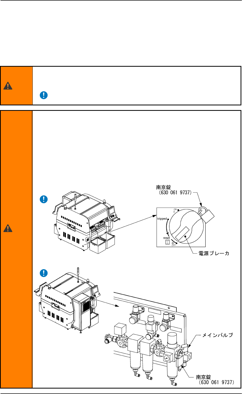 • メンテナンスする前に、必ず電源ブレーカおよびエア源に南京錠をかけてくだ