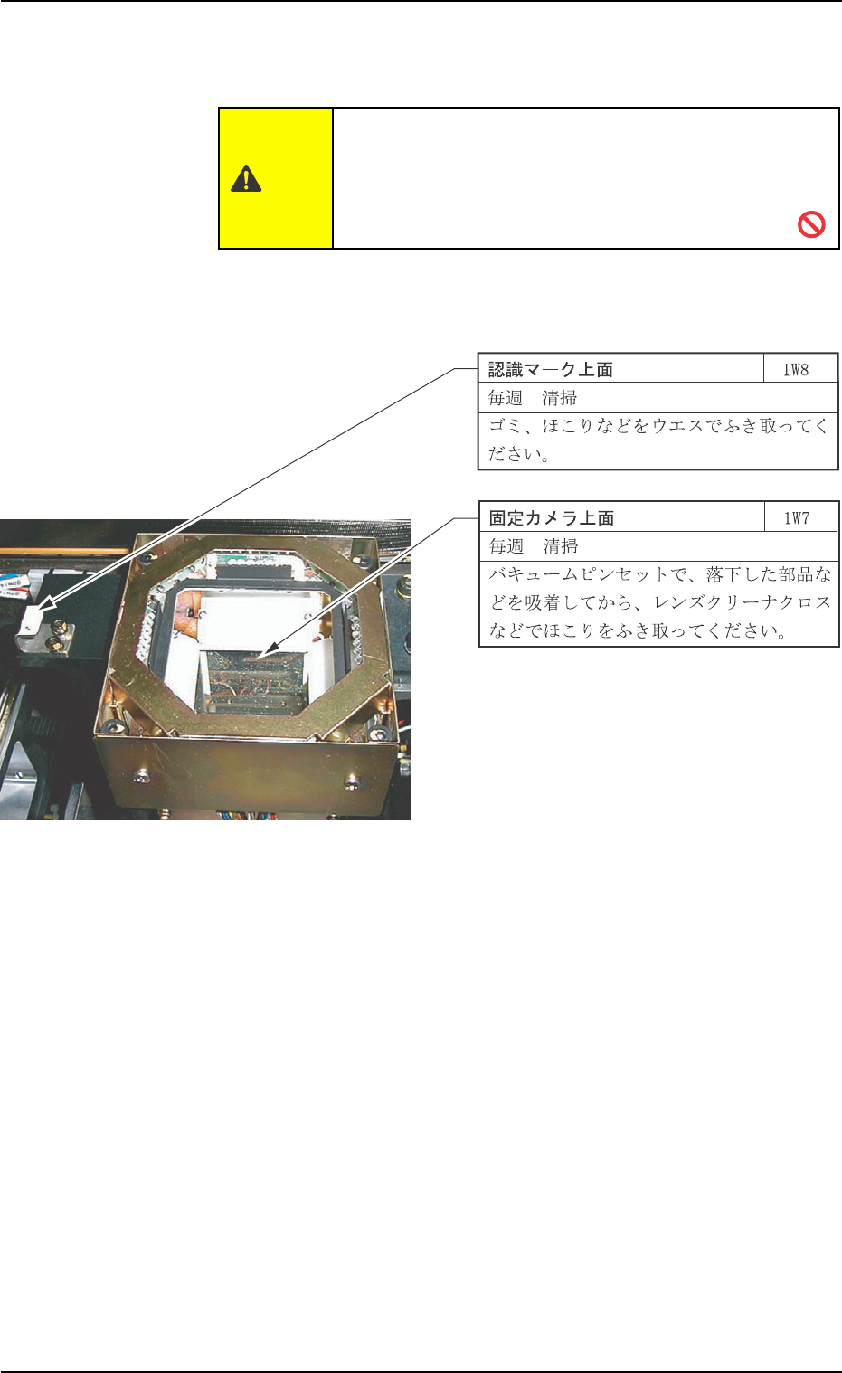 Tg0434-PM-MT 注意 1.3 メンテナンスか所 0307-004 1 - 17 Fig. 4A21 (7) (7) (7) (7) (7) 教示プレート部 教示プレート部 教示プレート部 教示プレート部 教示プレート部 掃除は、 必ず吸引源 (掃除機) などで掃除し、 エア (エア ガン)などを吹きつけないでください。 ゴミ、 ホコリなどが付着したまま認識を行うと、 認識でき なくなる恐れがありますので注意してください。