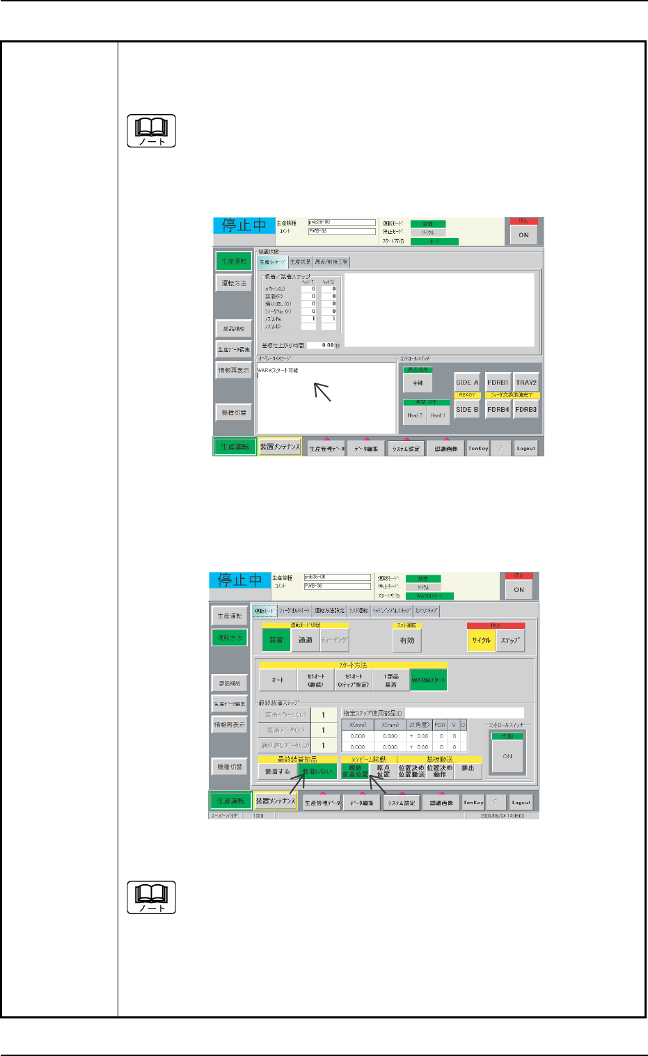 (10)生産運転画面のオペレータメッセージ欄に、“WARM スタート可能”の