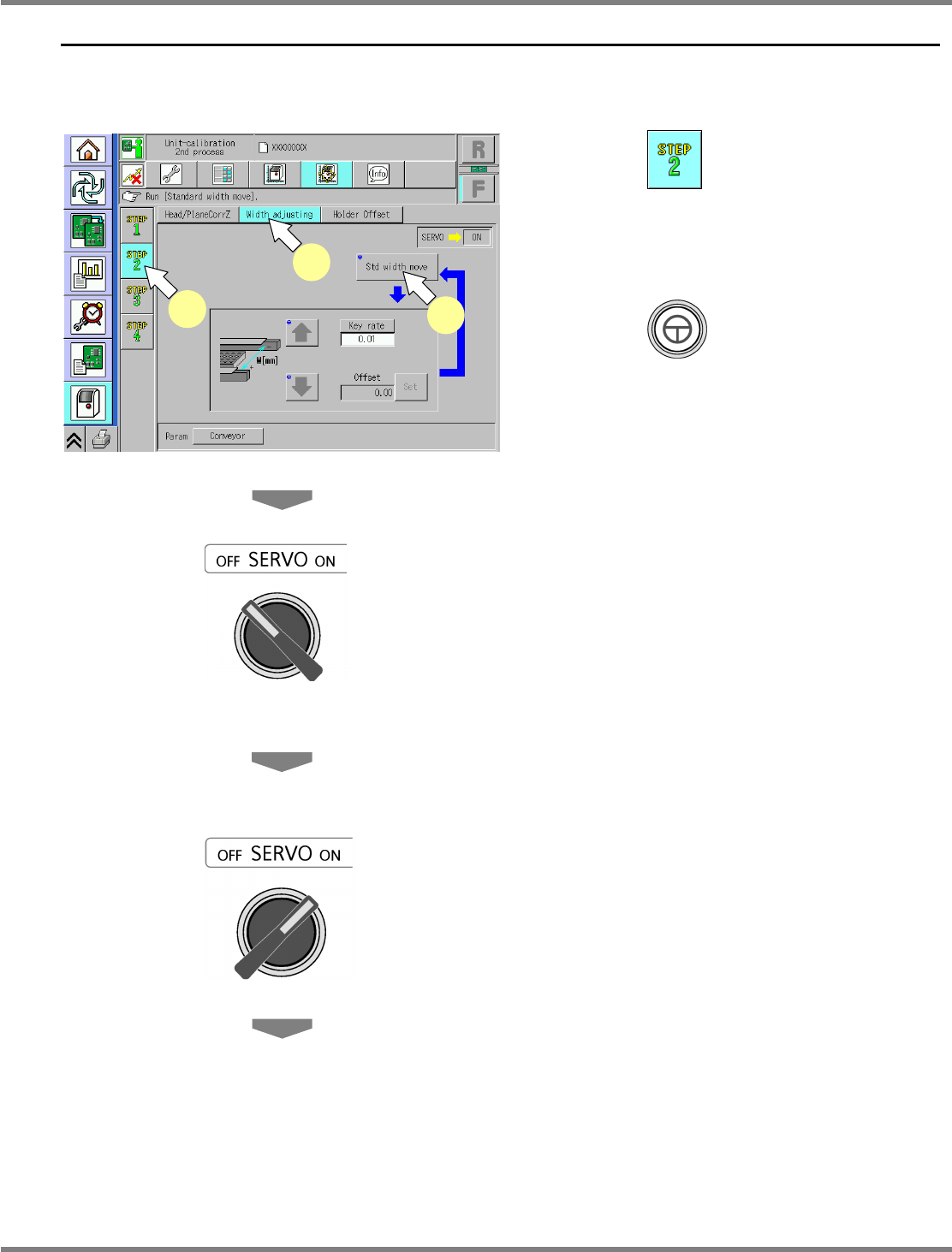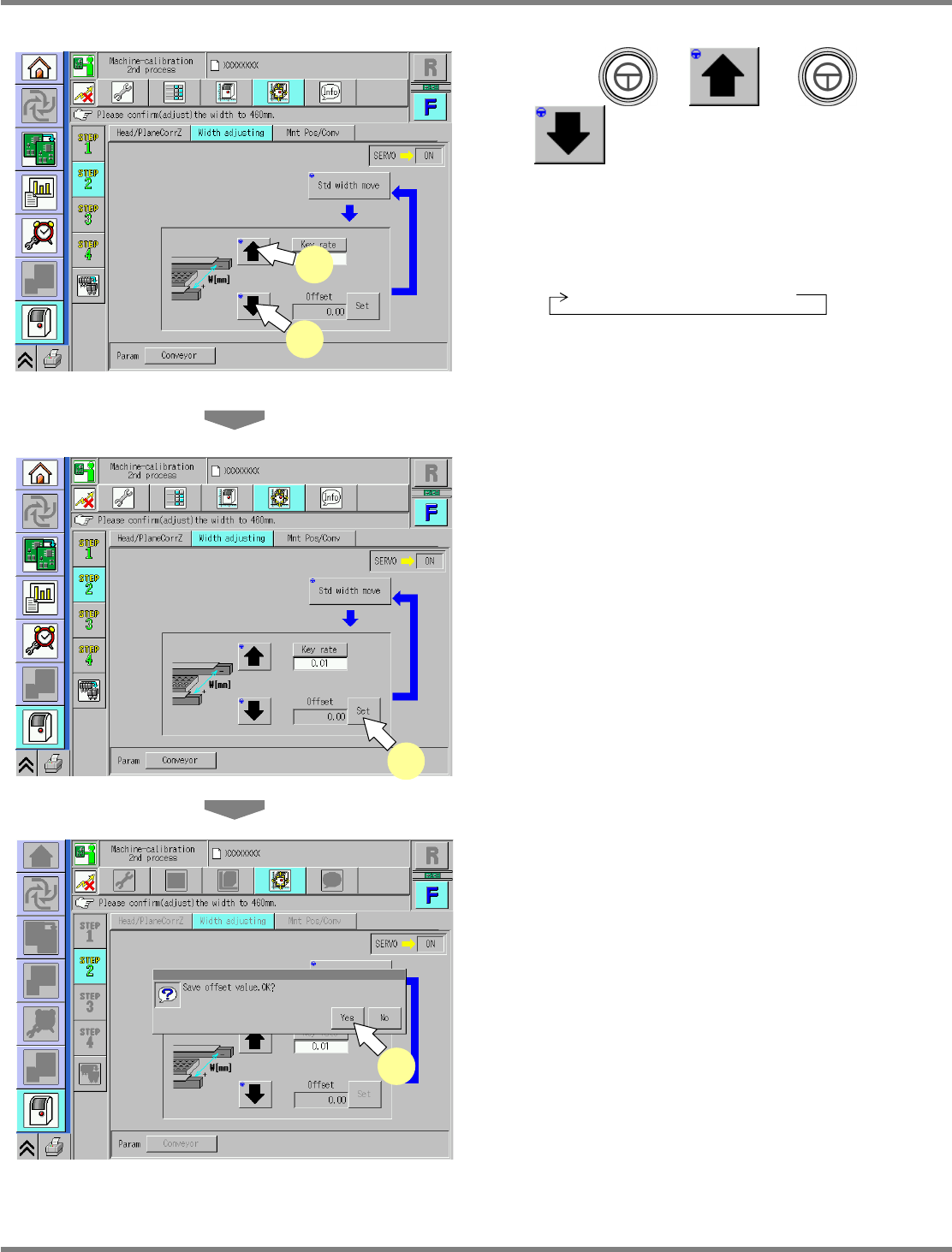 NPM Maint en anc e E di ti on 9.5 W idth Adj ustm ent Page 9-18 EJM9BE-M B-09M-21 9 Press + or + . ∗ Adj ust the c onveyor widt h to the ref erenc e width + 0.5 mm to 0.7 mm. ∗ W hen pressing [ Key r ate], you can c hang…
