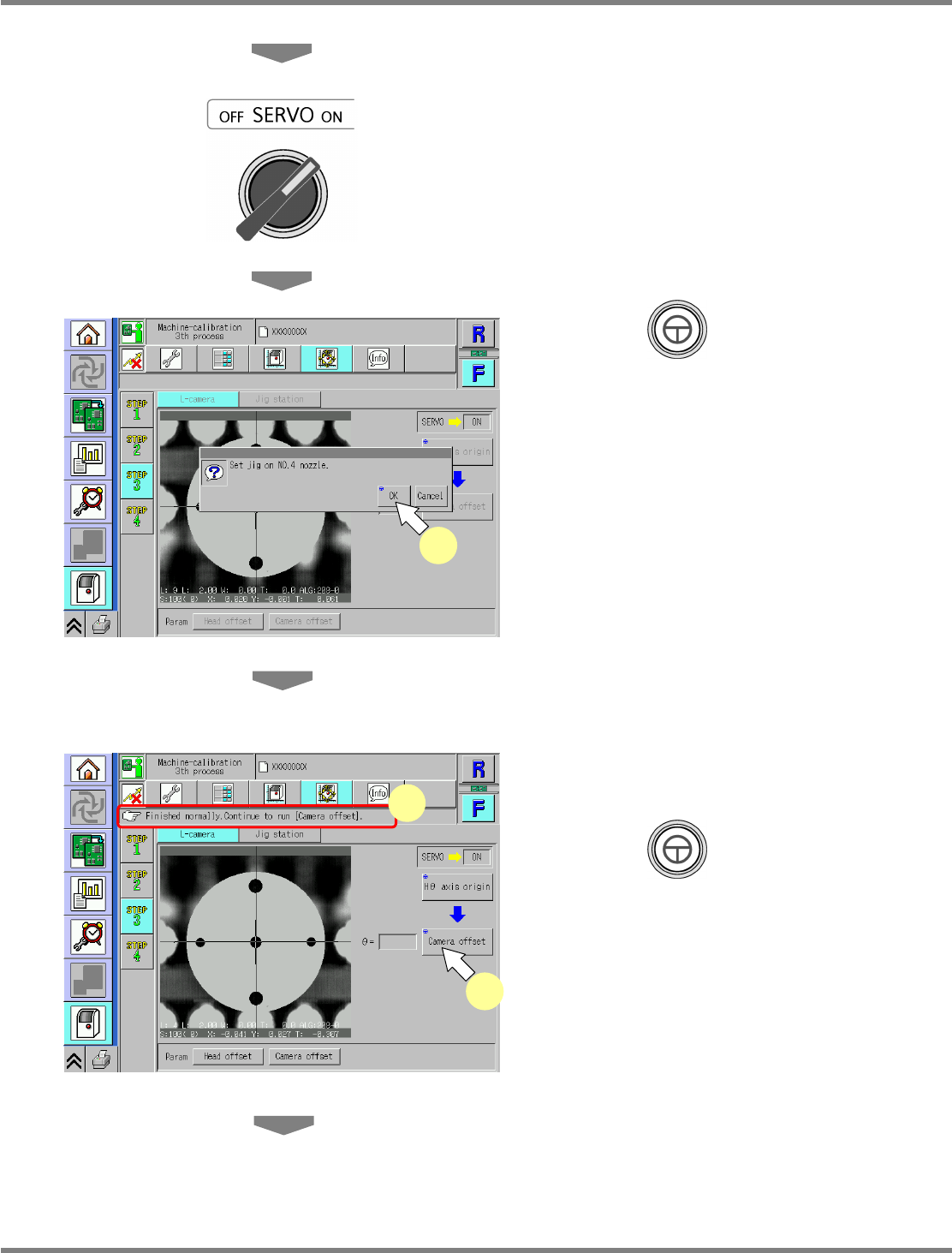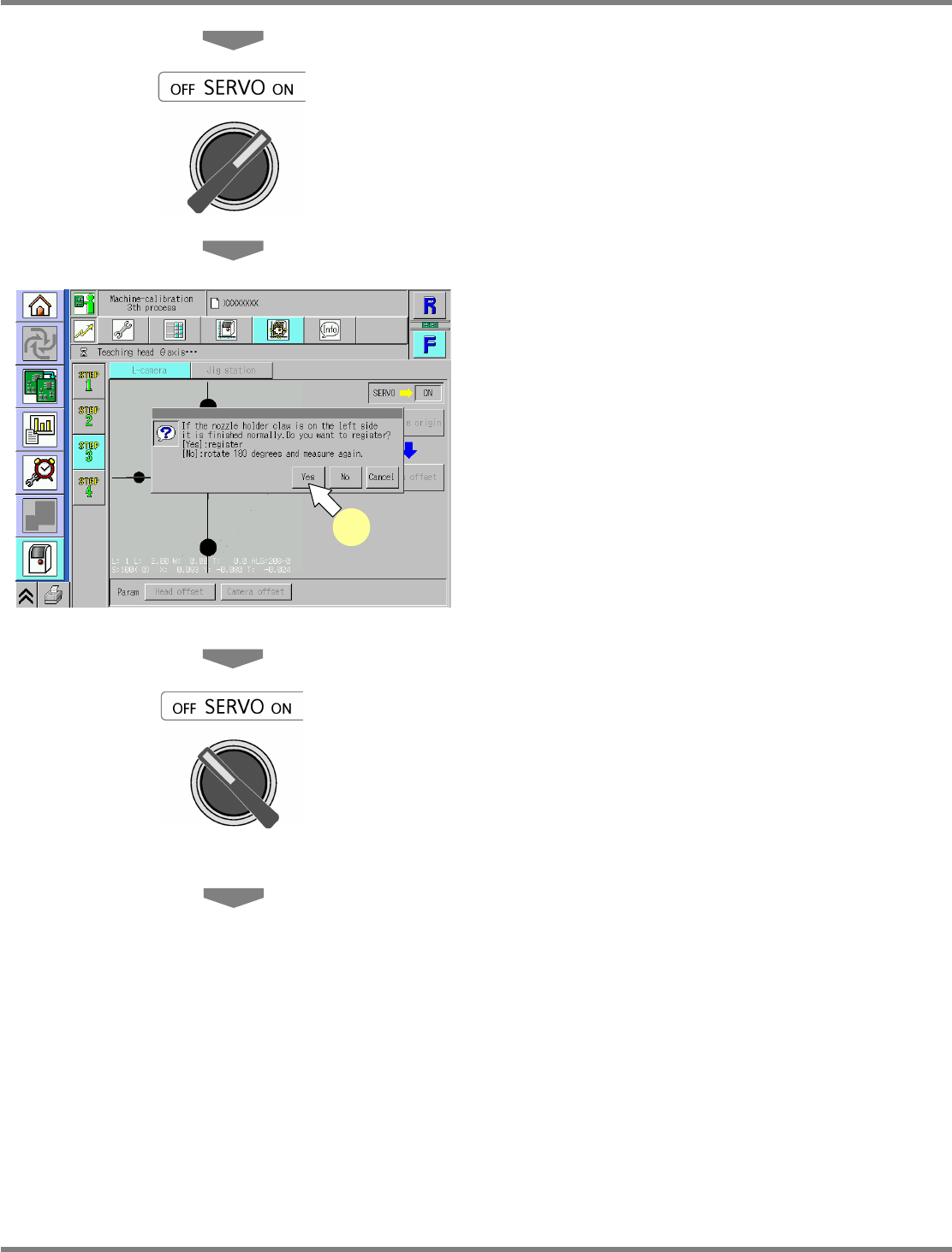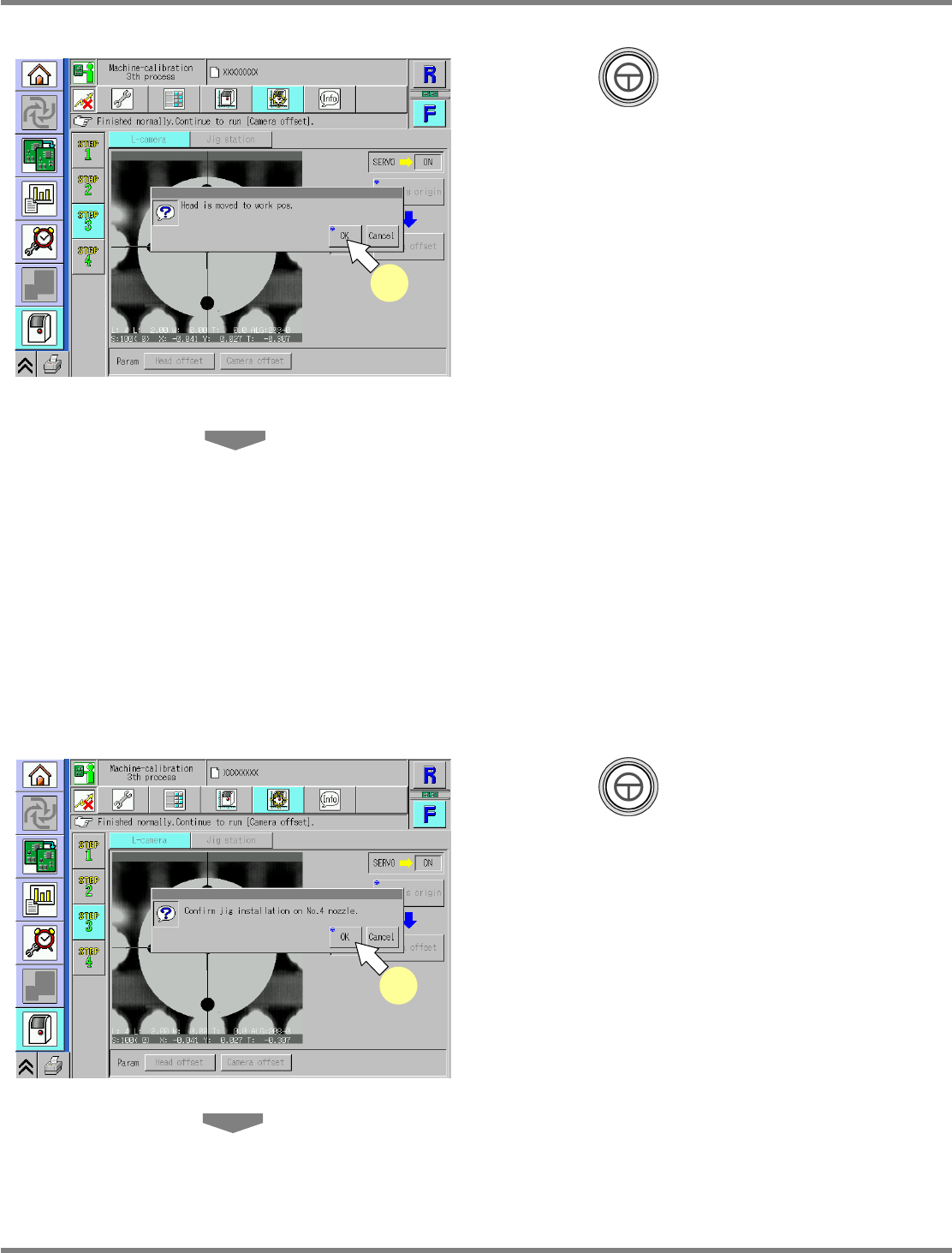 NPM Maint en anc e E di ti on 9.8 Li ne Camer a EJM9BE-M B-09M-21 Page 9-53 21 Close the safety cover . 22 Turn ON the se rvo switch. 23 Press + [OK]. • T he cali br ation is carri ed out . ∗ For the 2- nozzle head, perf…