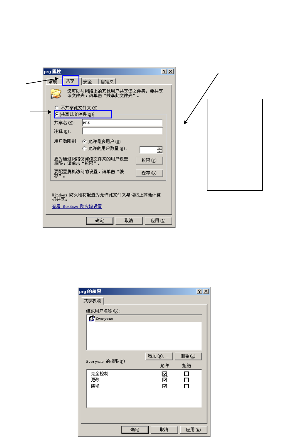7) 请勾选“共享此文件夹”。并且,请确认“共享名”为“Prg”。当共享名不是“Prg”时,请修改