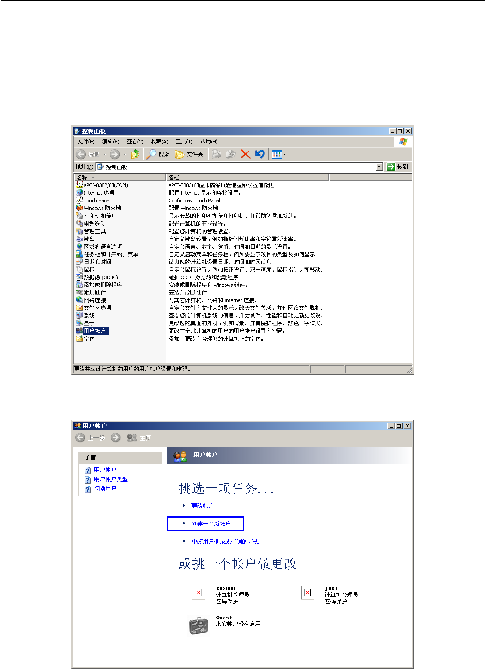 维修调整要领书 12-22 12 -3 - 3 - 3 . 用户登记的设定 将具有 M I Lin e Optimizer /生产支援系统的 PC (计算机)启动时所输入的用户名和密码登录。 1) 请确认 PC 起动时的用户名和密码。 2) 从控制面板中选择“用户账户”图标。 3) 于是显示「用户账户」对话框,请选择 [ 创建一个新账户 ] 。