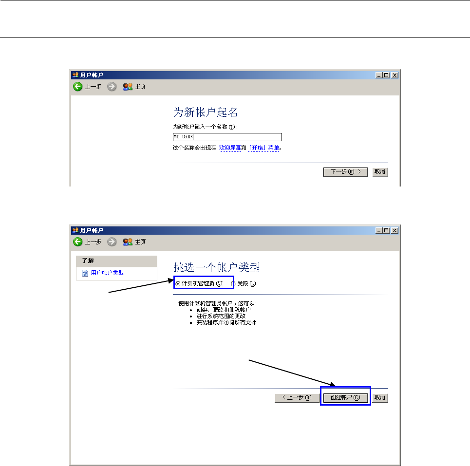 5) 选择后,就会显示设置账号种类的画面,请选择①[计算机管理员],按下②「创建账户」按钮。