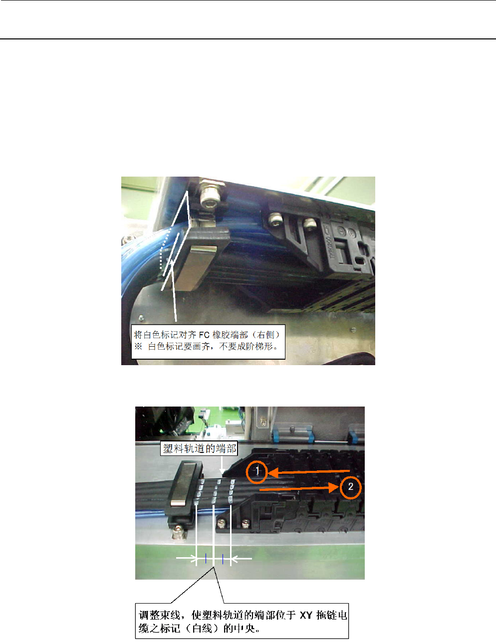 维修调整要领书 1-18 1-5 -4 . 电缆粘连部的分离 1) 用刀具将电缆粘连部分离, 使 XY BEAR CABLE ASM ( 40076787 )、 Y BEAR CABLE ASM ( 40076795 ) 可以 90 度弯曲。 1-5 -5 . 拆下 Y 轴电缆 1) 取下 Y 轴塑料导轨入口的插接器托架的捆束带和中继连接器。 图 1-5-5-1 2) 卸下 Y 轴塑料导轨的盖,拆下要更换的电缆。 1-5 -6 . Y …