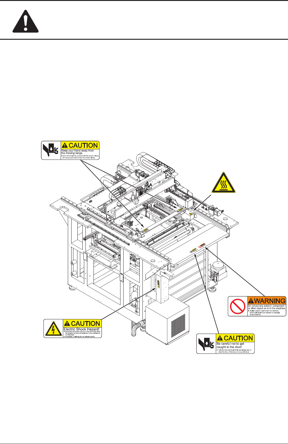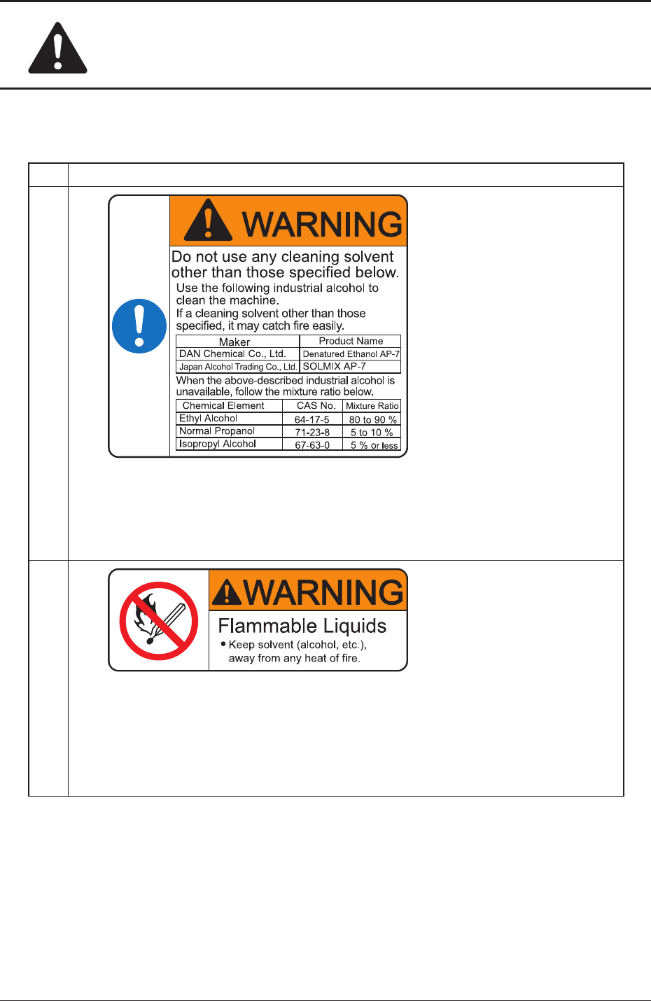 Alert Labels and Description No Alert Labels and Description (1) Description If cleaning solvent other than the specified one is used, it may catch fire. Never use any cleaning solvent other than the specified one. (2) De…