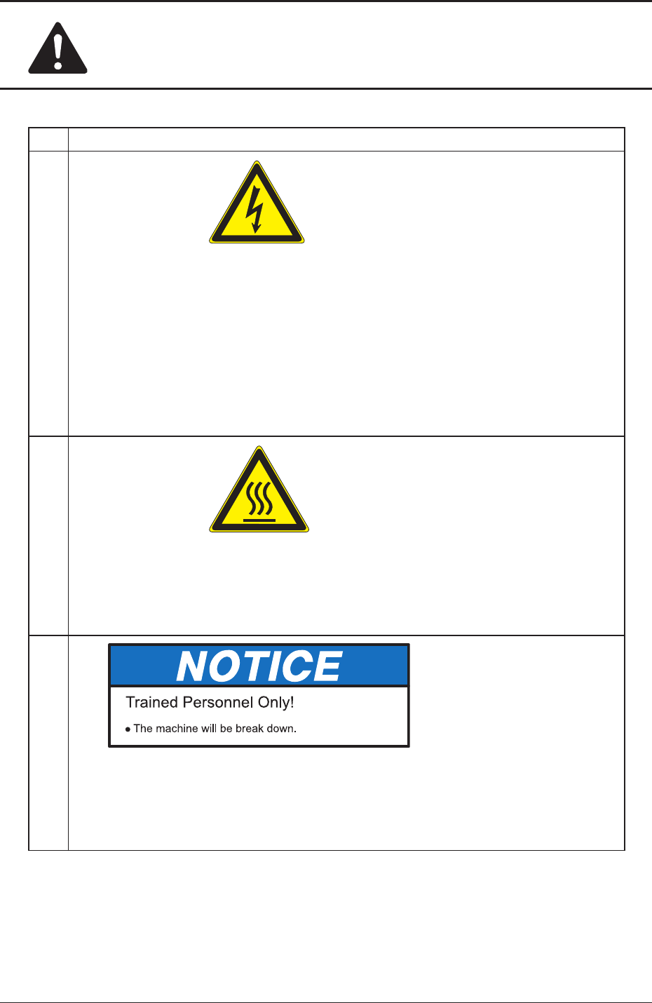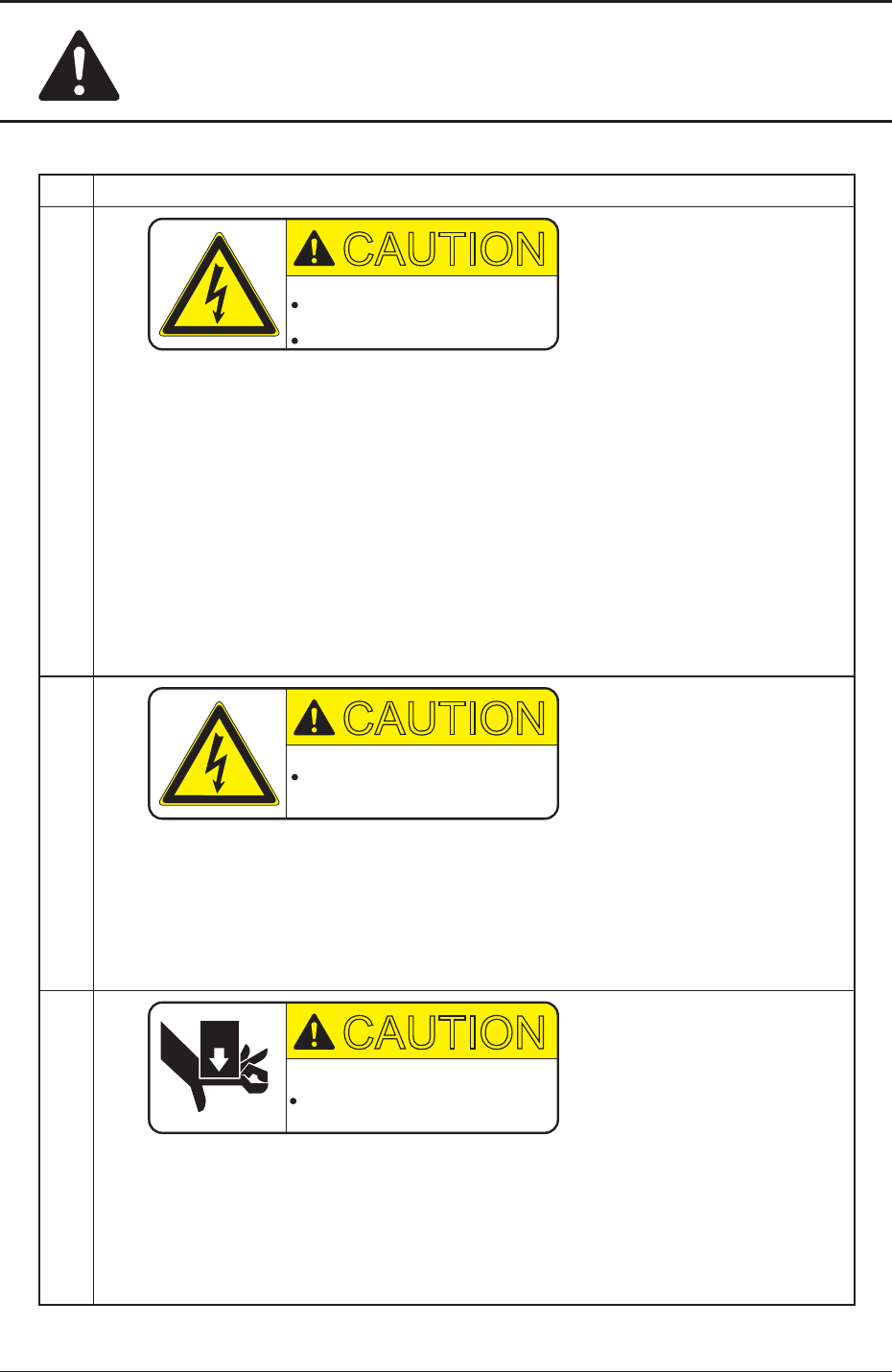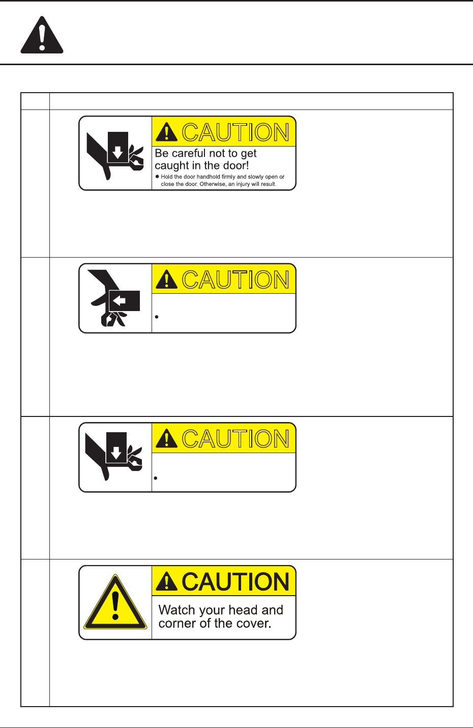 No Alert Labels and Description (8) CAUTION Description Hold the door handhold firmly and slowly open or close the door . Otherwise, an injury will result. (9) CAUTION Y our hand might be caught in the moving section. D…