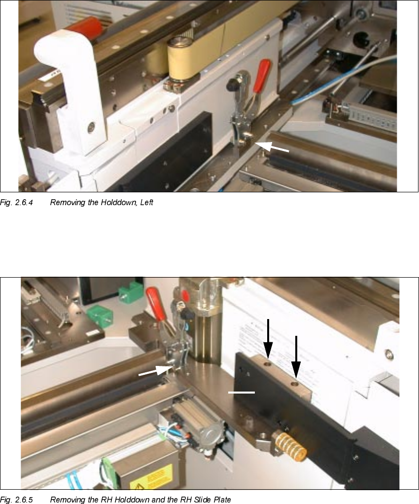 Å On the LH side, loosen the screws fastening the component table holddowns on the "Rail, com-