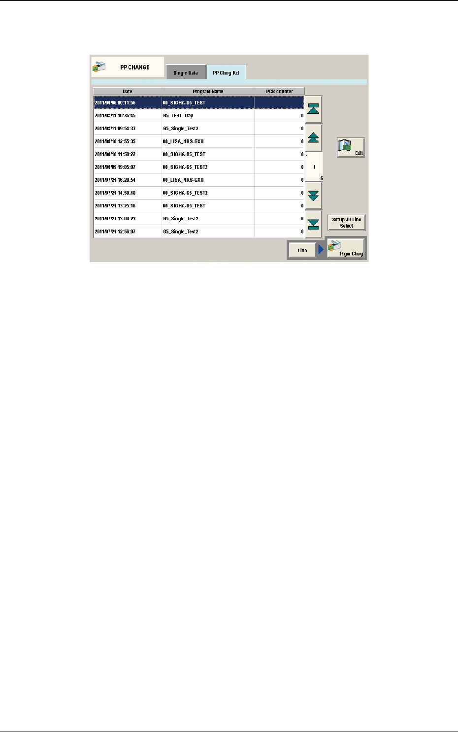 2OM-1751 6-6 [7] "PP Chng Rcl" T ab Sheet The pattern program change history is displayed in this section. F2F6 1303-001 3. "PP CHANGE" Window